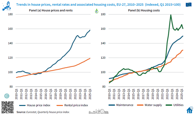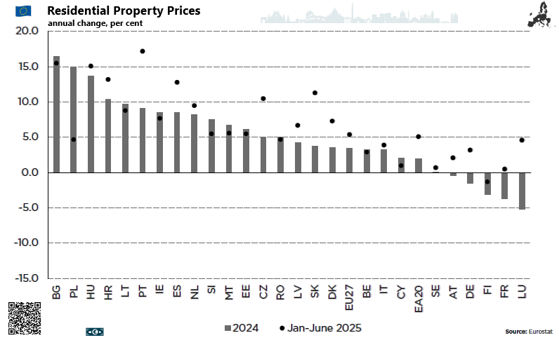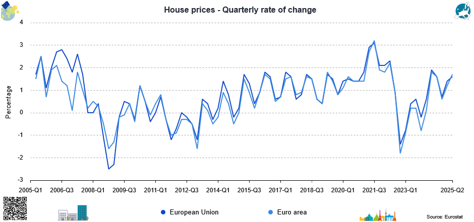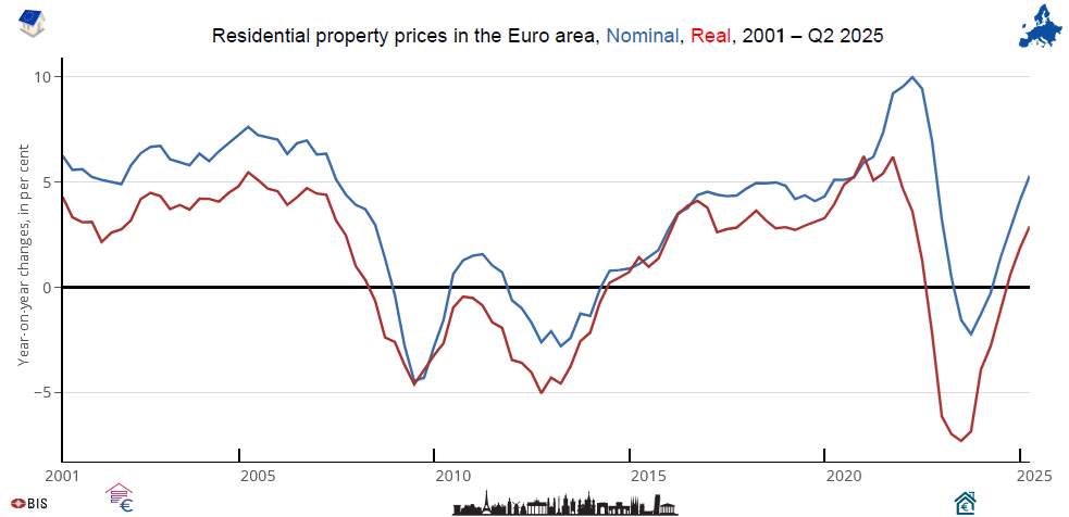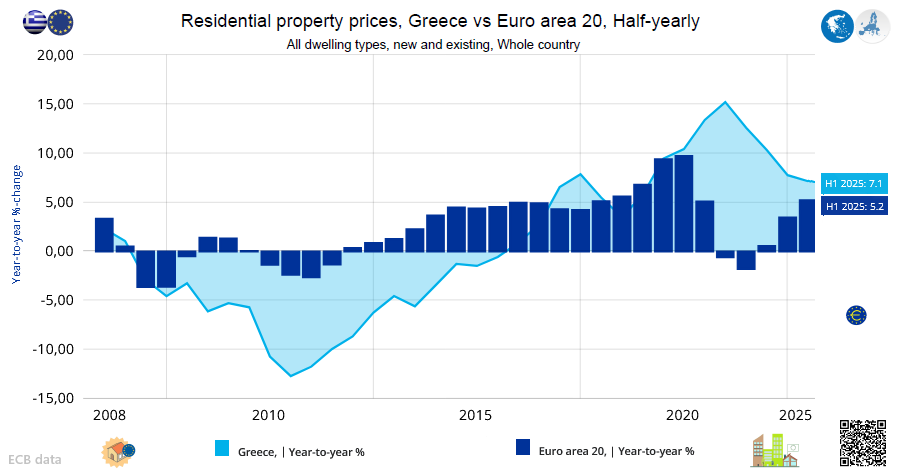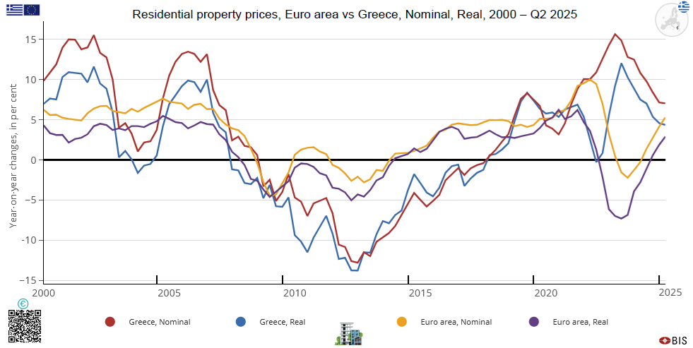 Residential property prices in Greece vs Spain vs Euro area, from 2007 to Q2 2025