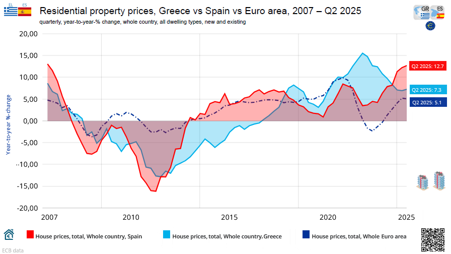 Τιμή κατοικιών, Ελλάδα vs Ισπανία vs Ευρωζώνη, από το 2007 έως το δεύτερο τρίμηνο του 2025
