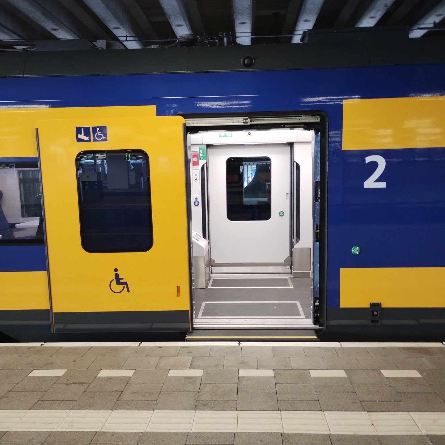 At a train platform, a blue and yellow NS train car welcomes mobility devices with a wide door that's about 1½ meters. (Every door on this train is this wide.) Between the train and the concrete/paved platform is a ramp of about 25 cm. It extends from the train to the platform and leaves no gap. It has a gritty, anti-slip coating and a bright yellow line. The platform, ramp, and train floor are all level.
