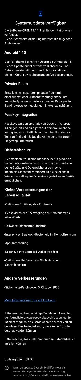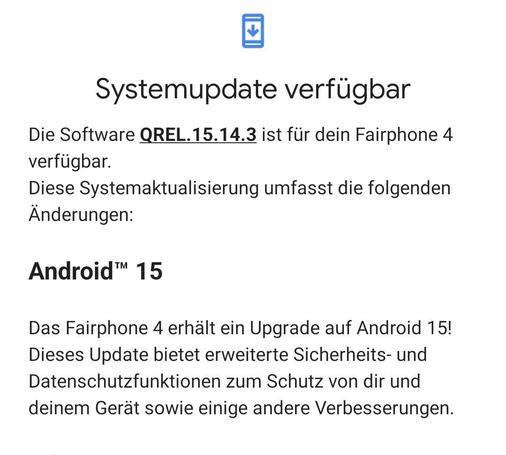 Huch! Ich sehe gerade, dass es für das #Fairphone4 ein #Systemupdate auf #Android15 gibt – offensichtlich wird die Version 14 übergangen.