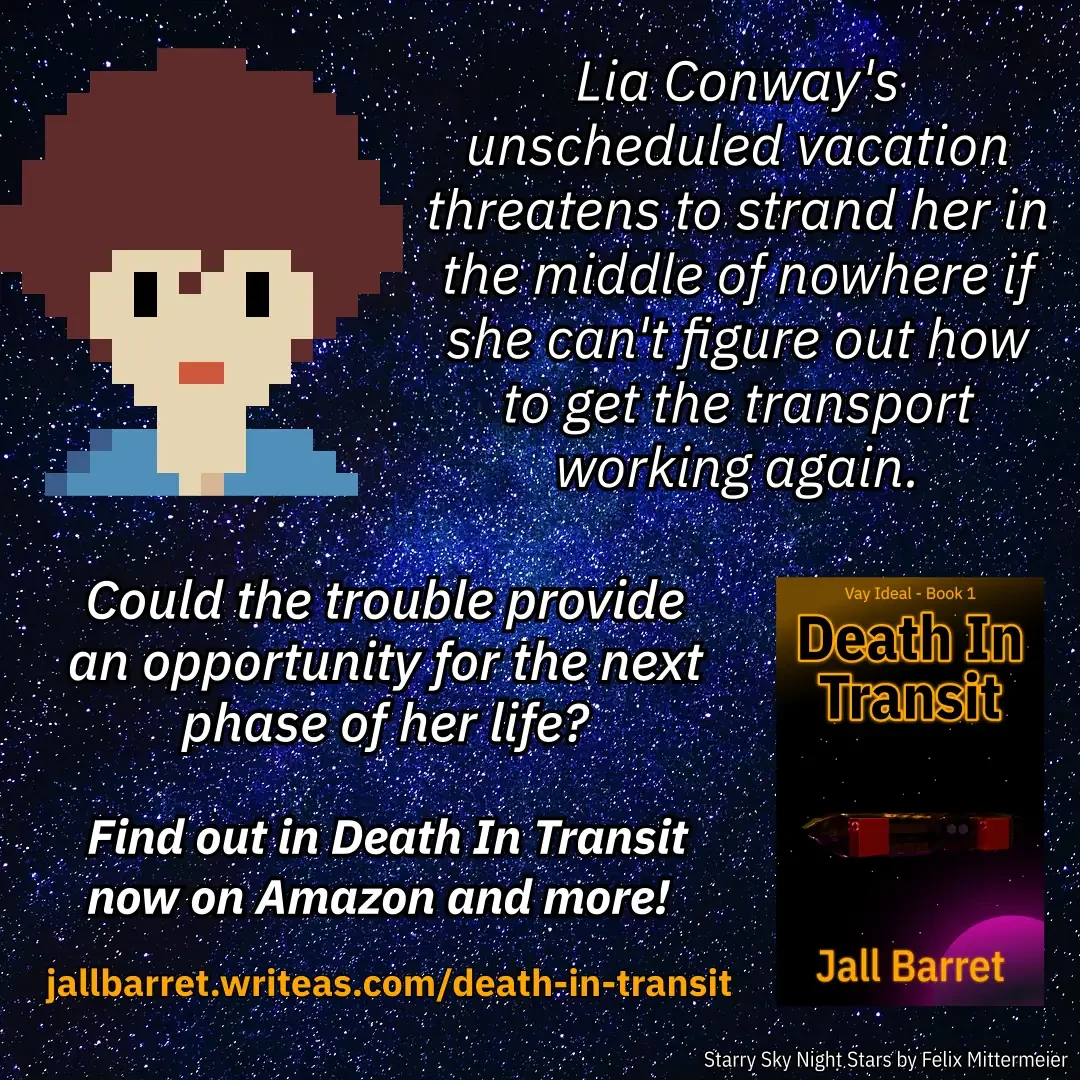 Check out my scifi adventure story, Death In Transit. @bookstodon@fedigroups.social Mechanical issues aren't the only interruption in Lia Conway's unplanned vacation. Can her skills help her to build a new life?
