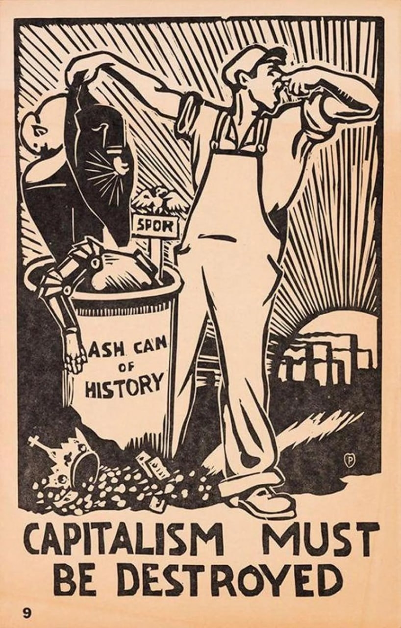 Poster of the #Socialist Labor Party of America 1936. The inscription on the container= capitalist: "the trash can of history." The tank and next to it already contain the symbol of the ancient Roman slave-owning state, as well as knight's armor and crown, symbolizing the era of #feudalism.