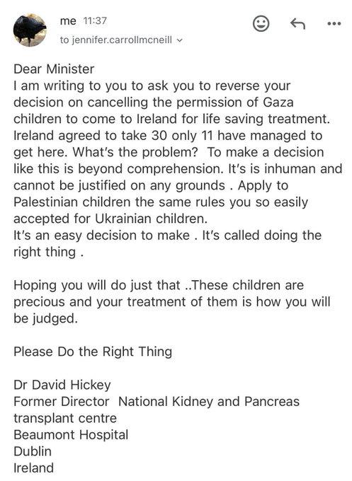 "Dr David Hickeyâs letter to Health Minister #CarrollMcNeill on cancelling the permission that allows Gazan children to come to Ireland for life saving treatment.â