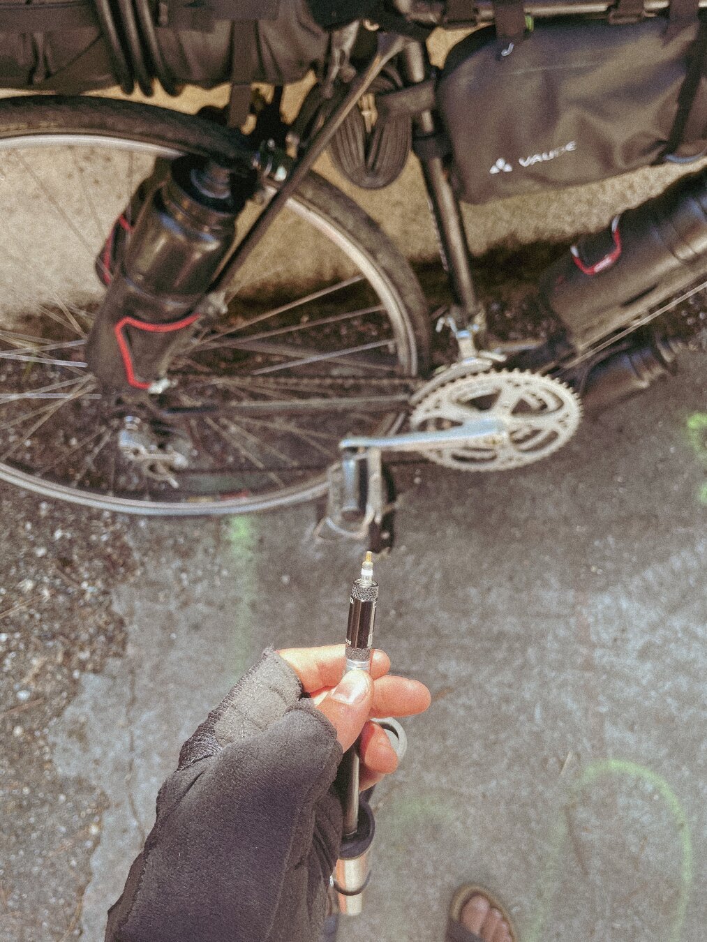 Actually the first time with my #gravelbike. It's on tubeless and I use very good tires but this one didn't resist a small sharp piece of glass... And of course, as I am a very intelligent bikerider I didn't have the tools to fix it!! 🤔
