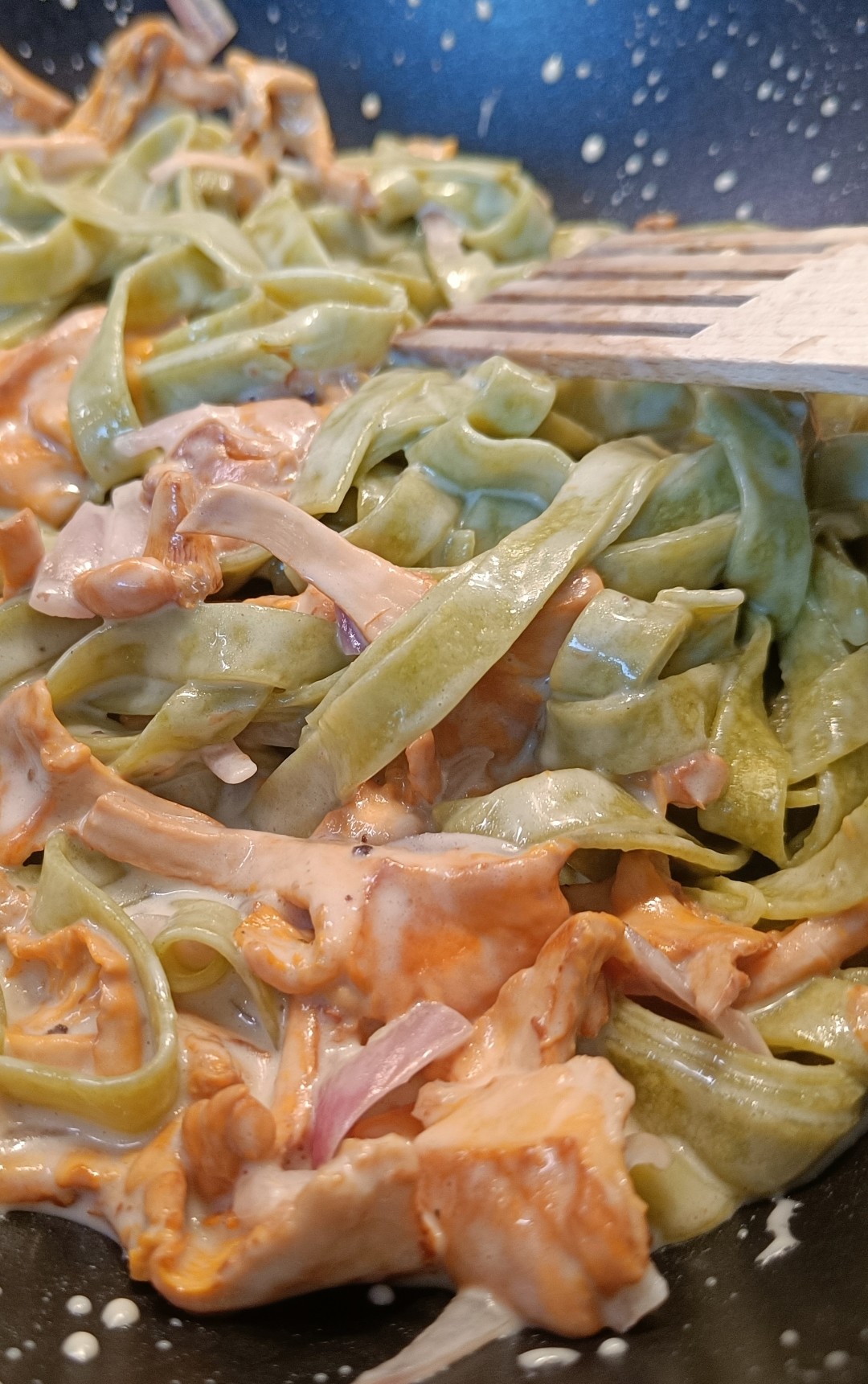 My lunch #today - spinach pasta and red onion, black pepper, salt, chanterelles and cheesy cream. Yummy! #cooking #foodofmastodon