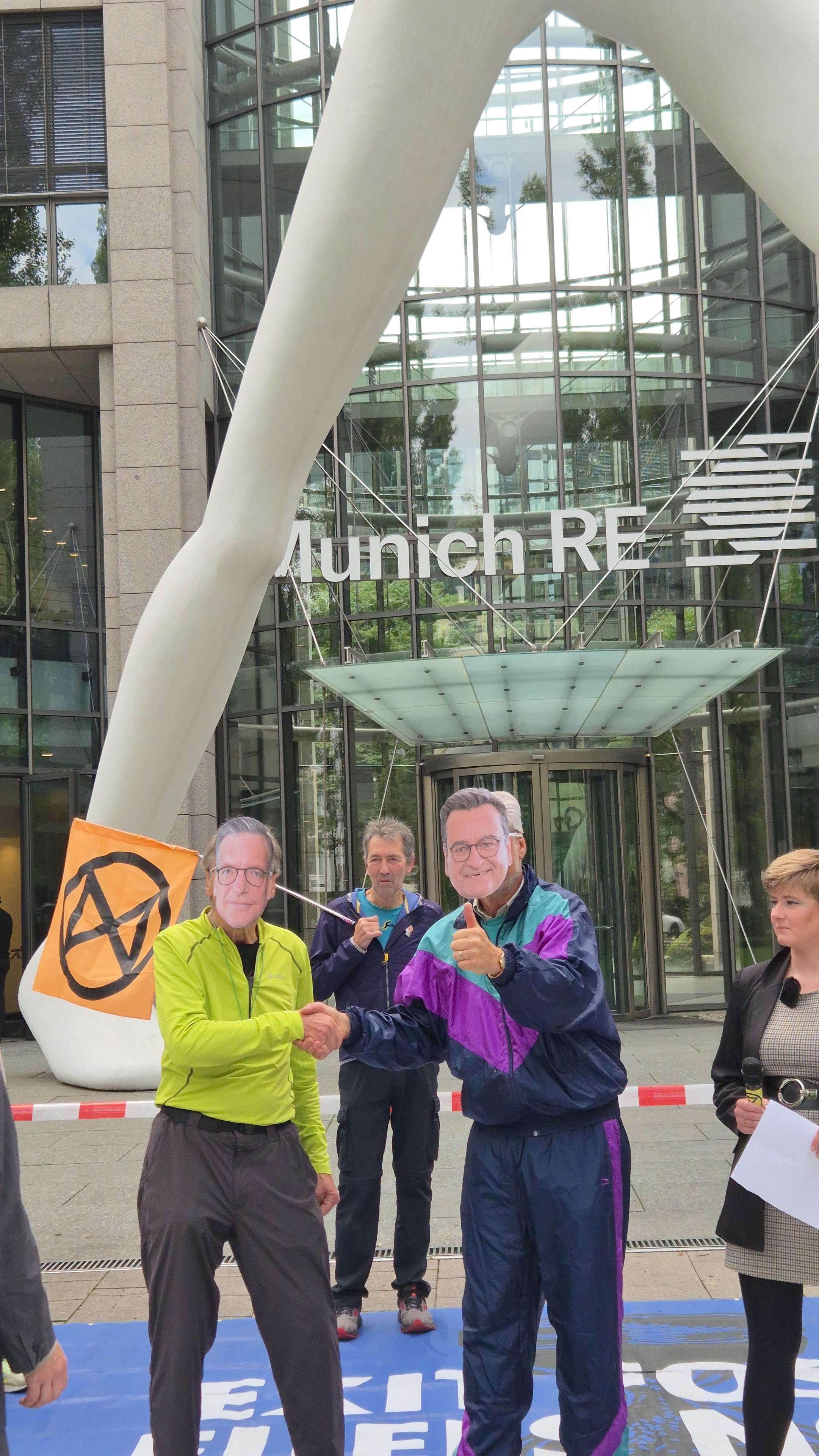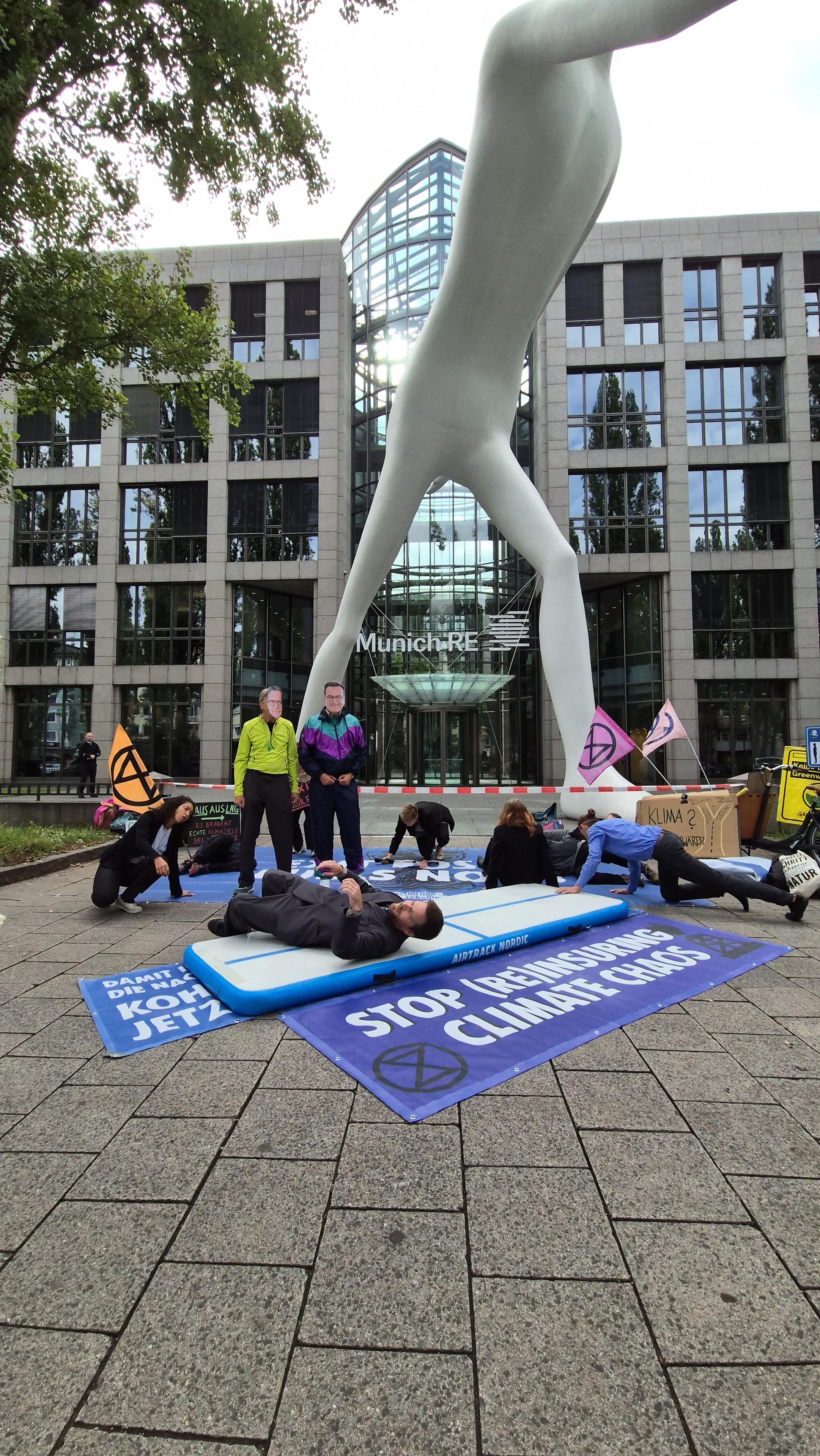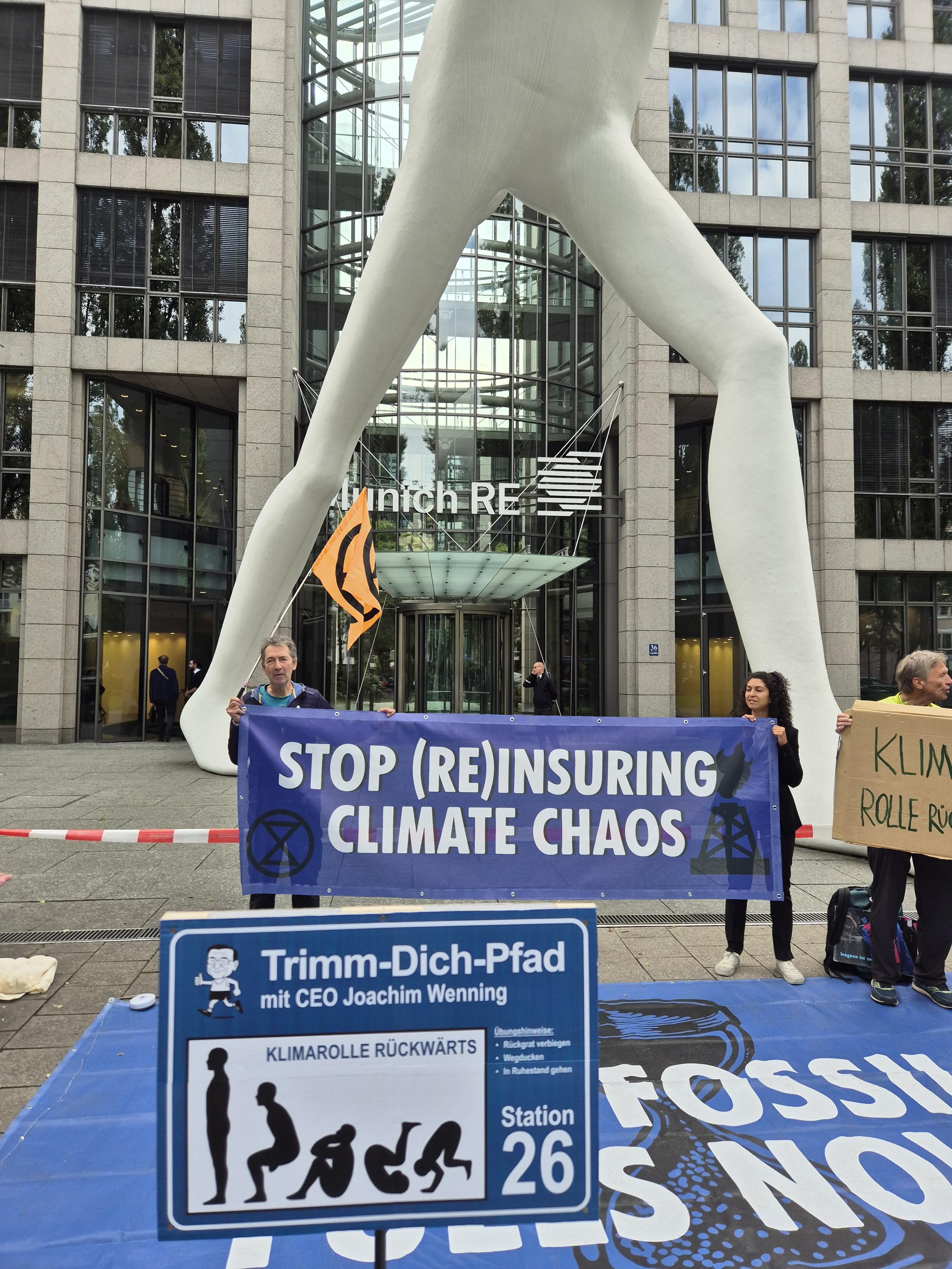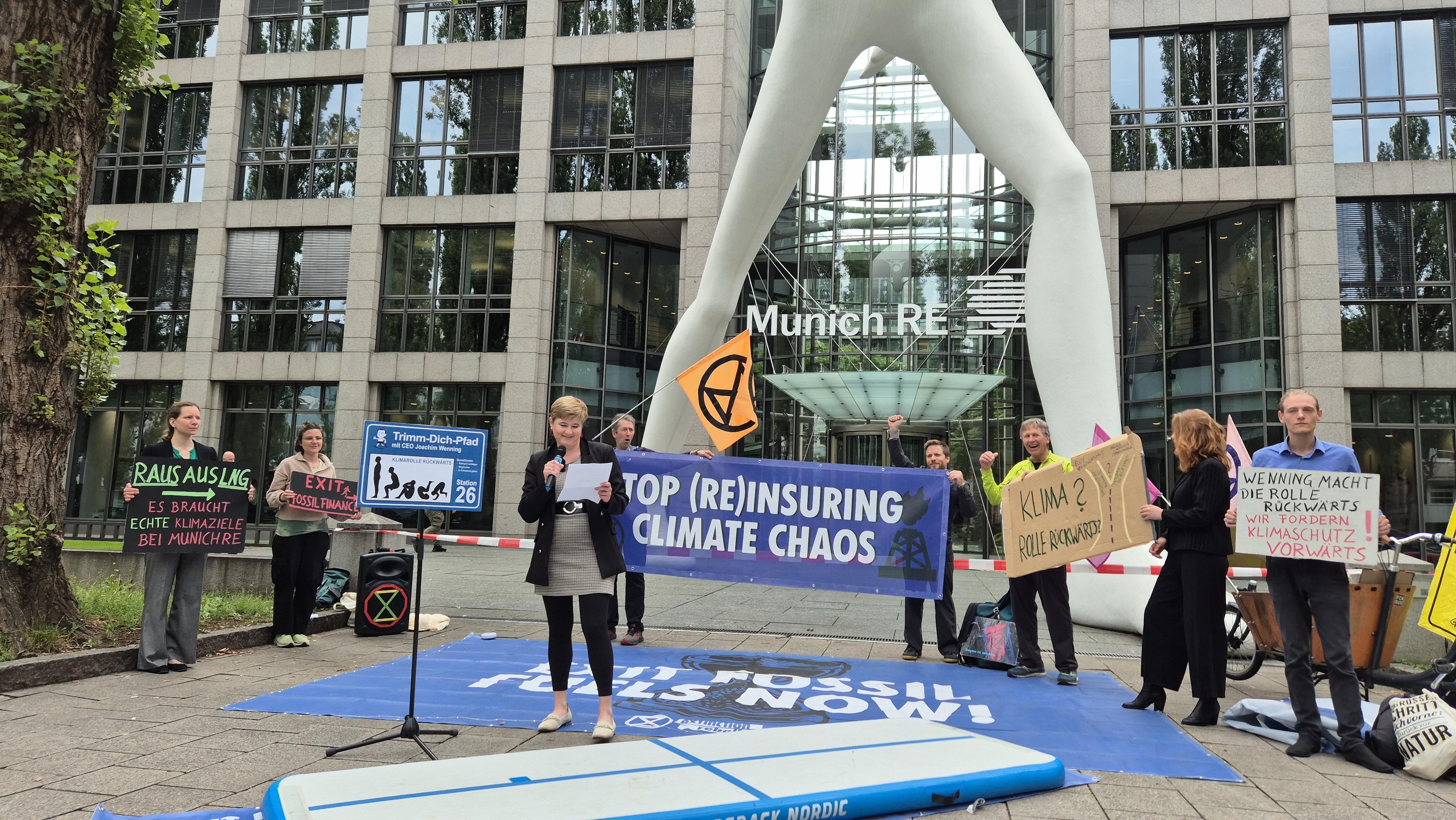 🌀 Munich Re trainiert die "Klimarolle rückwärts": Mit einer Aktion vor dem Konzernsitz in München protestierten Aktivist*innen gegen den Rückzug aus internationalen Klimaallianzen und fossile Geschäftspraktiken.