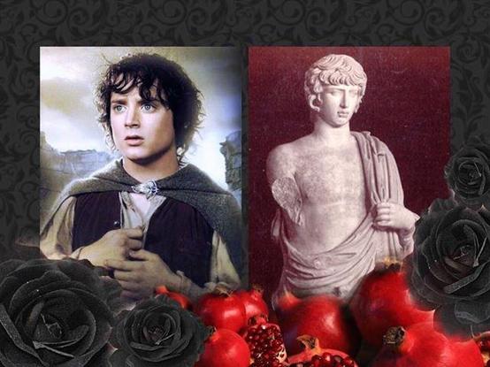🪷 22 Sept is #HobbitDay: Artist #MirandaBaggins says: "I think #Frodo bears a great resemblance to #Antinous. His trial with the Evil One Ring is particularly fitting for the #Eleusis mysteries. I've placed him and #Antinoos side by side with black roses and pomegranates!" 🪷