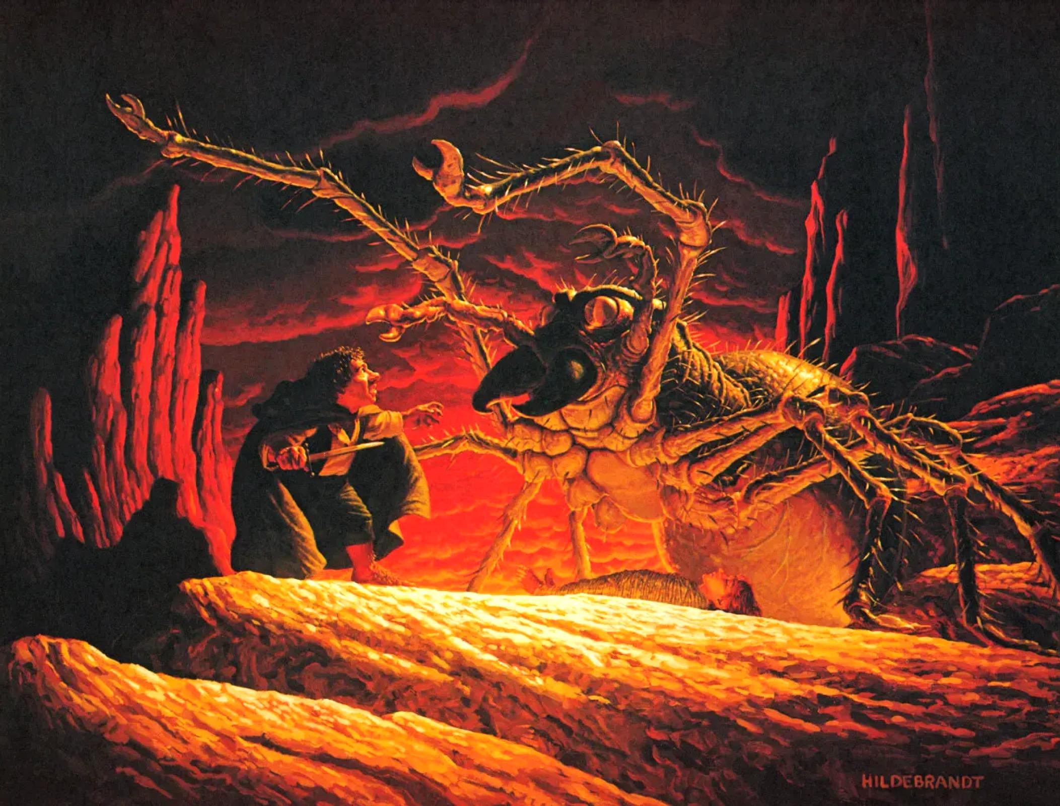 #vintagefantasyart #fantasyart #fantasyillustration #tolkien #lordoftherings #lotr #timhildebrandt #GregHildebrandt #hildebrandtbrothers #hobbits #FrodoBaggins #Frodo #Shelob