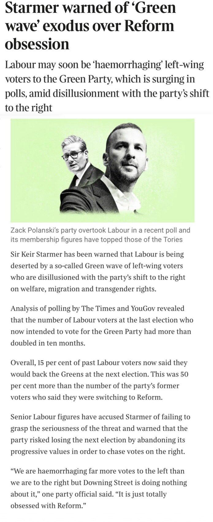 "Overall, 15 percent of past Labour voters now said they would back the Greens at the next election. This was 50 percent more than the number of the party's former voters who said they were switching to Reform."