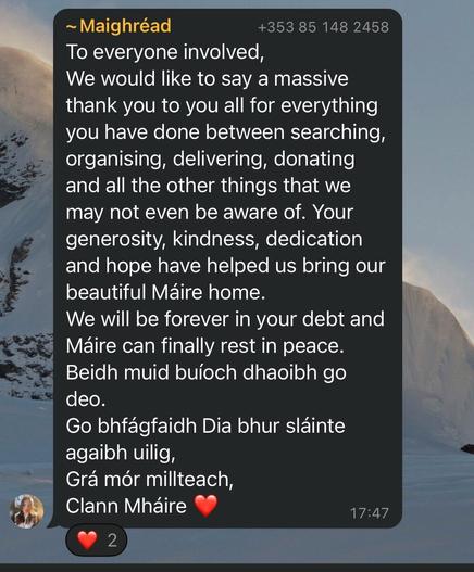 Today, Máire Nà Fhátharta was found by volunteers on Silverstrand Beach, not far from where she went missing in the foggy morning of 12th November.