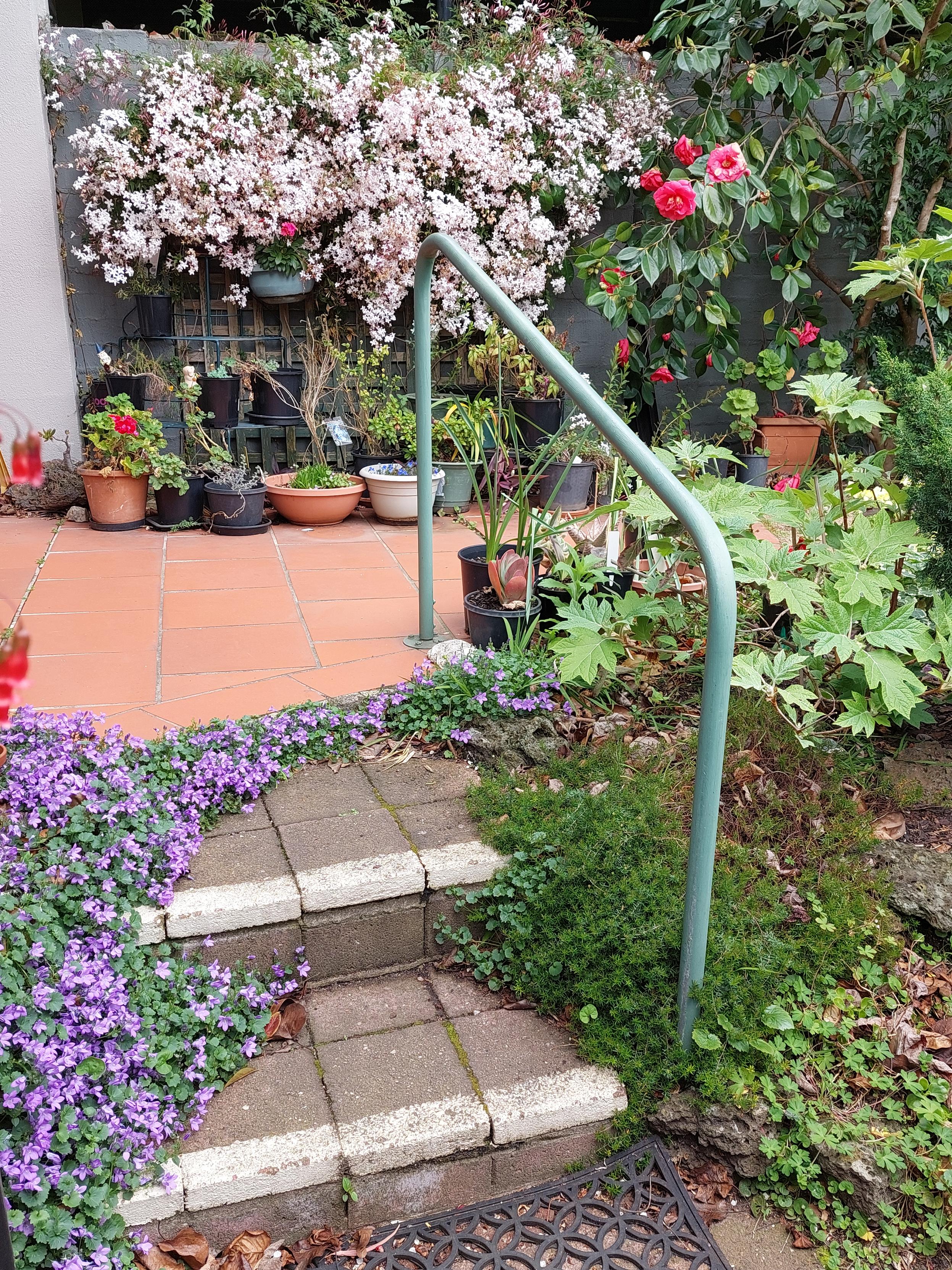 My mother's garden is stunning at this time of year. In this photo masses of campanula flowers grow along the steps with white jasmine profusely flowering in the background and a couple of large red flowers from a camellia next to the jasmine.