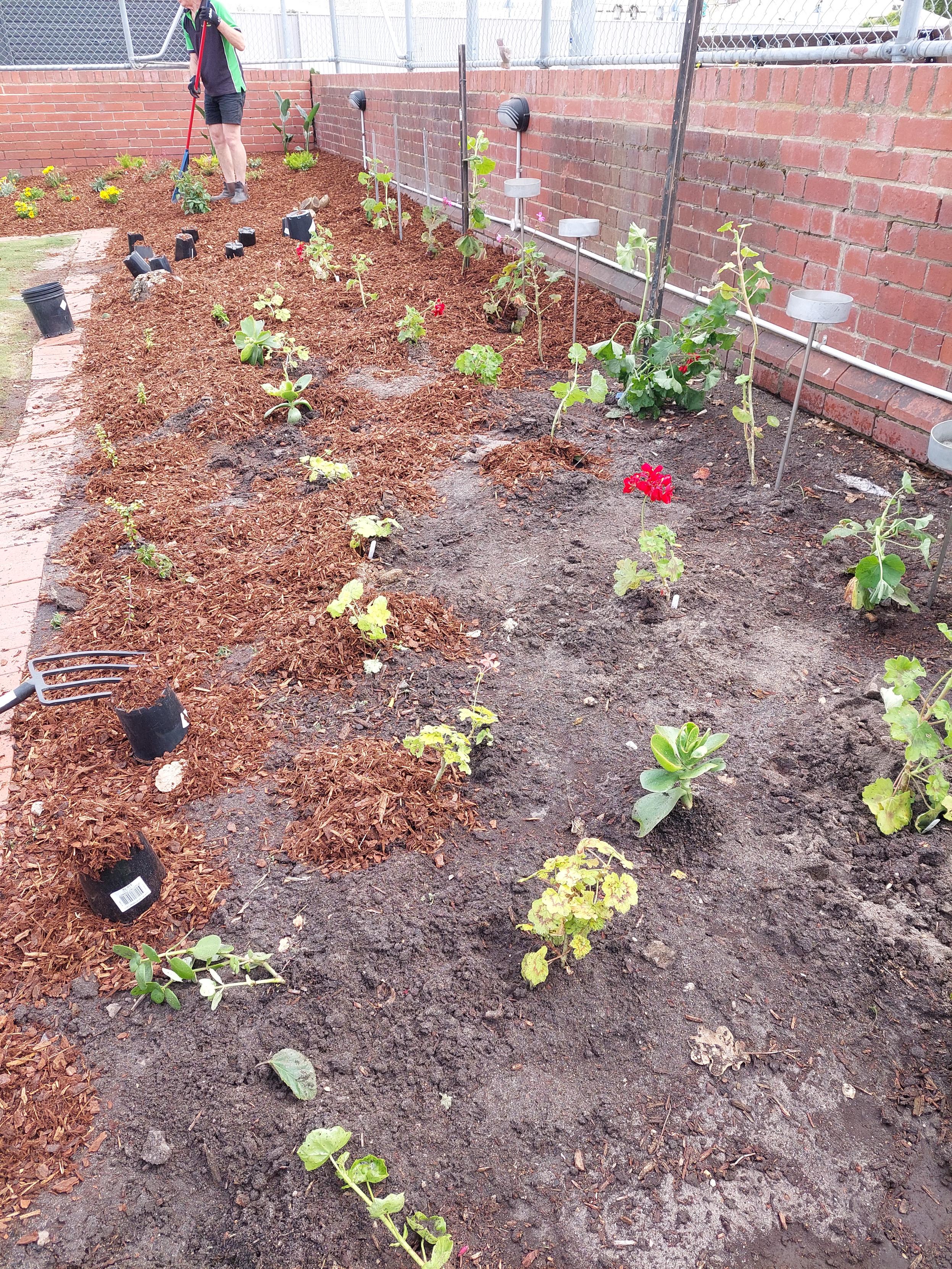 Our gardening group contributed all the plants pictured (up to the man standing in the background) and more to a lawn bowls club this morning. At a working bee at the bowls club we and lots of club volunteers cleared this patch and planted all these plants.