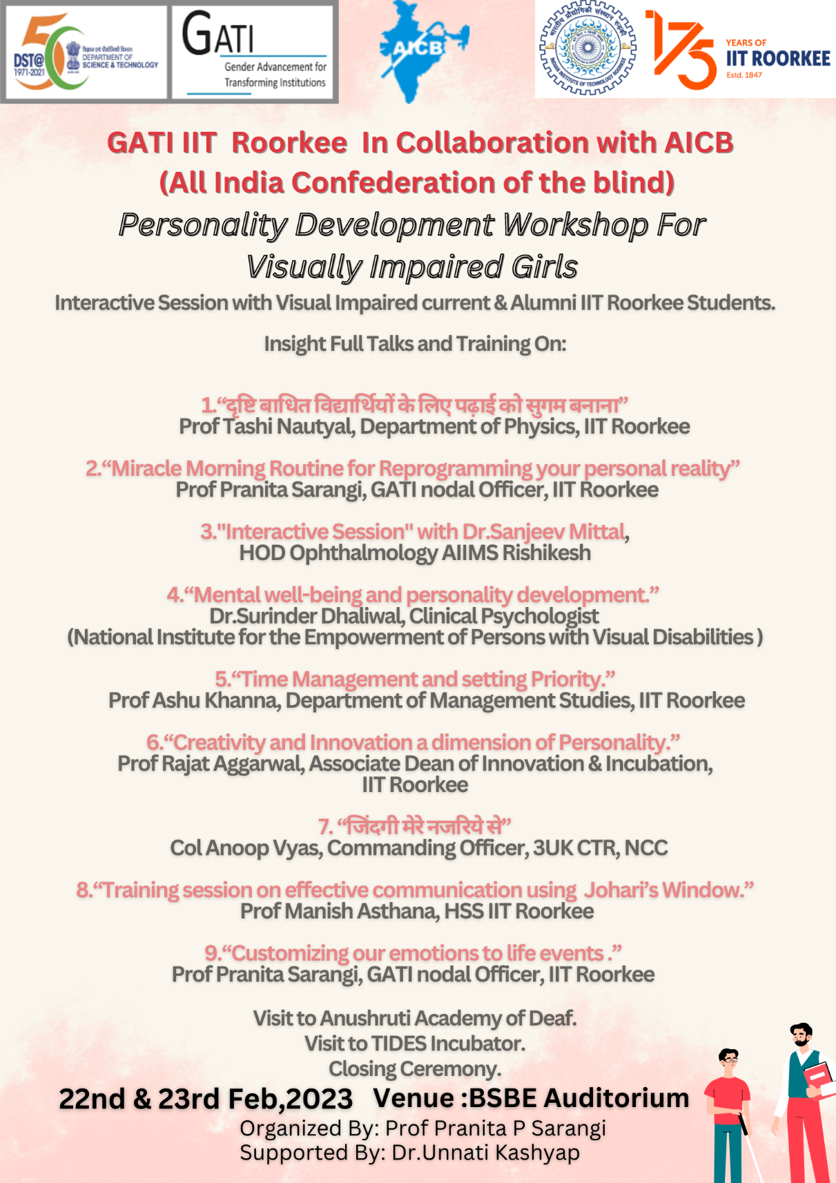 The Gender Advancement for transforming Institutions #GATI pilot program, @iitroorkee is organizing a one and half-day personality development workshop from 22nd to 23rd Feb 2023 for visually impaired girls students from the All India Confederation of the Blinds (AICB), New Delhi