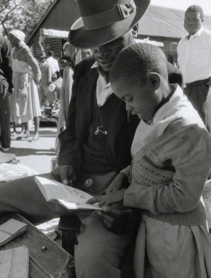 A Vender in Salibury, Rhodesia (Now Harare, Zimbabwe) teaching his daughter to read in 1960.