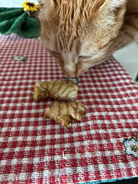 Just harvested some fresh ginger, of which Carmela ( #Mel ) our #rescuecat is investigating. Now I know why #gingercat are named so. Same coloring and markings. #catsofMastodon #caturday