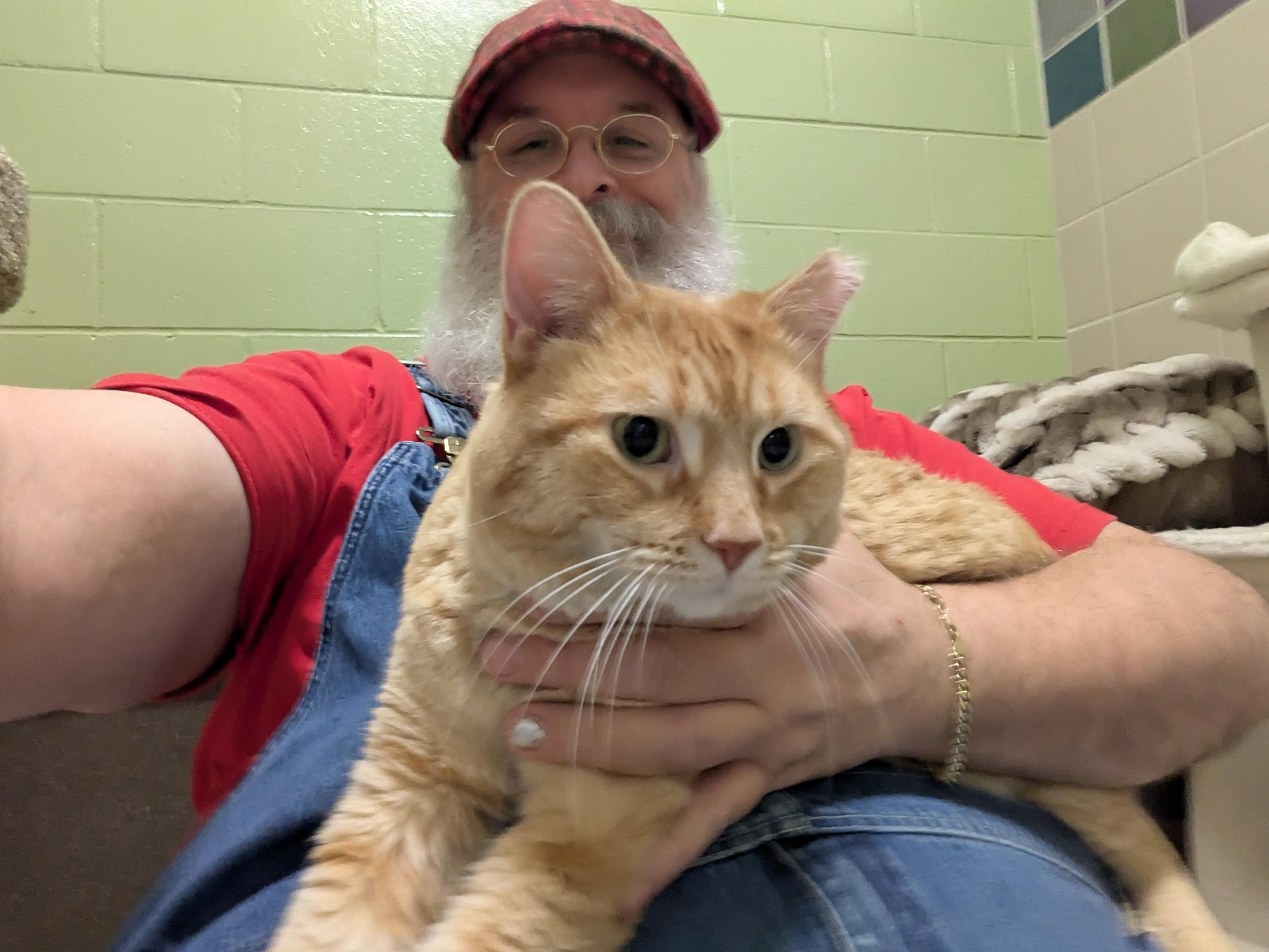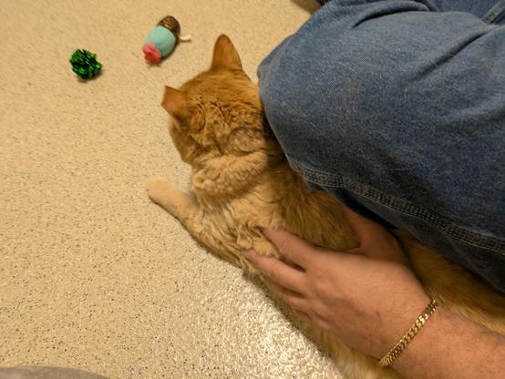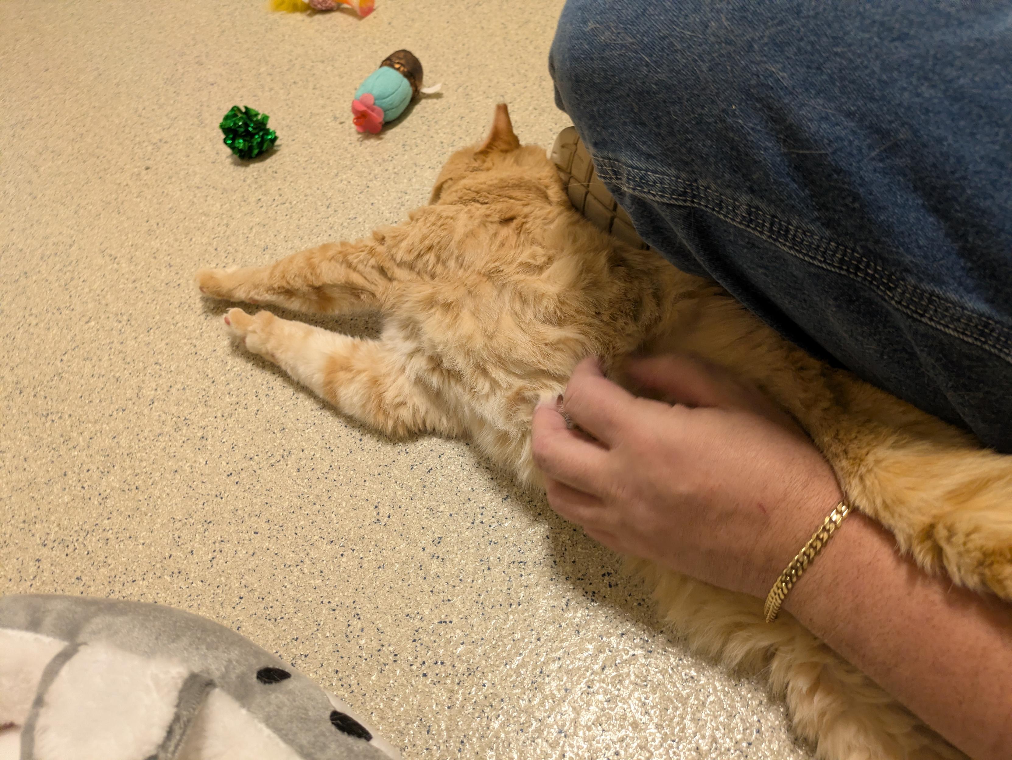 He just got moved from a cage to one of the encounter rooms and he's like a whole different cat - rubbing all over me, meowing, getting me to rub his belly, and climbing up on my chest while purring his head off.