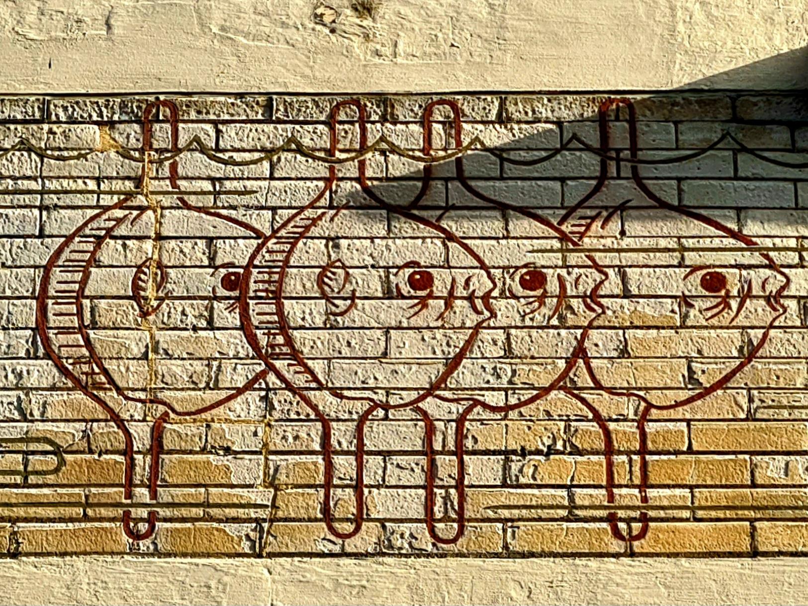 A sunfish mural on the side of the Chemistry building of Glasgow University where it faces the Zoology building across a narrow lane. Sunfish are the largest bony fish in the world, and can reach the size, and weight, of a small car. In the warmer summer months, they can occassionally be found off the West Coast of Scotland.