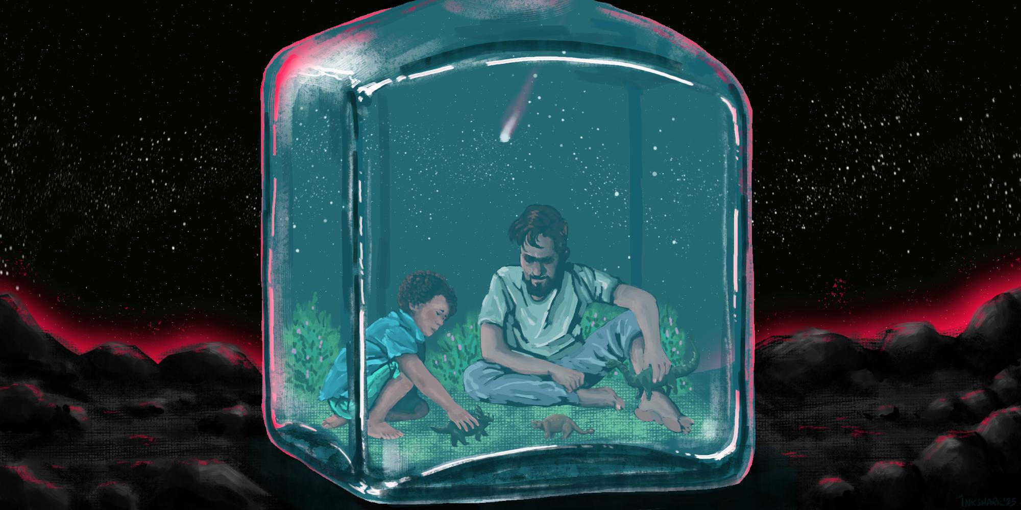 #Illustration #DigitalArt #DigitalPainting #MastoArt #wonder #persistence #extinction #TheSmallThings #TheLittleThings #PlasticDinosaurs #TerrariumArt #VivariumArt #bottle #jar #GlassBottle #GlassJar #ApocalypseArt #apocalypse #asteroid #comet #meteor