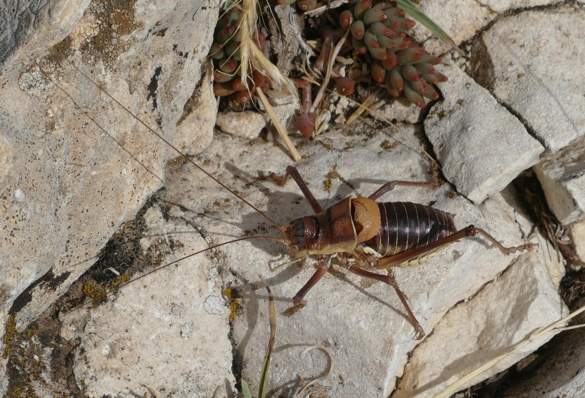 Eine Grille oben auf dem höchsten Berg der Provinz Alicante. Ich hatte bisher hier nur die lauten Zikaden gesehen und gehört und war sehr überrascht, auf der Aitana einige Grillen zu sehen und zu hören.