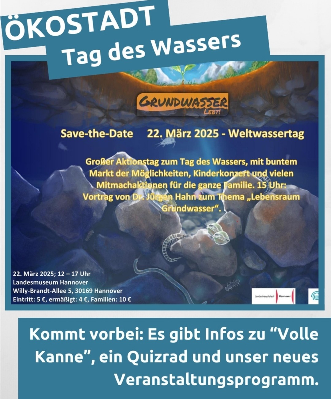Ökostadt e.V.: "Am Freitag, 21. März wird im Landesmuseum Hannover die Ausstellung "Grundwasser lebt!" eröffnet. Zum Welttag des Wassers am Samstag, 22. März findet dort ein Aktionstag statt. Wir sind mit einem Info-Stand dabei... und bringen auch unser frisch eingetroffenes neues Veranstaltungsprogramm für 2025 mit. Die Ausstellung findet noch bis zum 14.09. statt... Mehr Infos: www.oekostadt.de." Landesmuseum Hannover Willy-Brandt-Allee 5