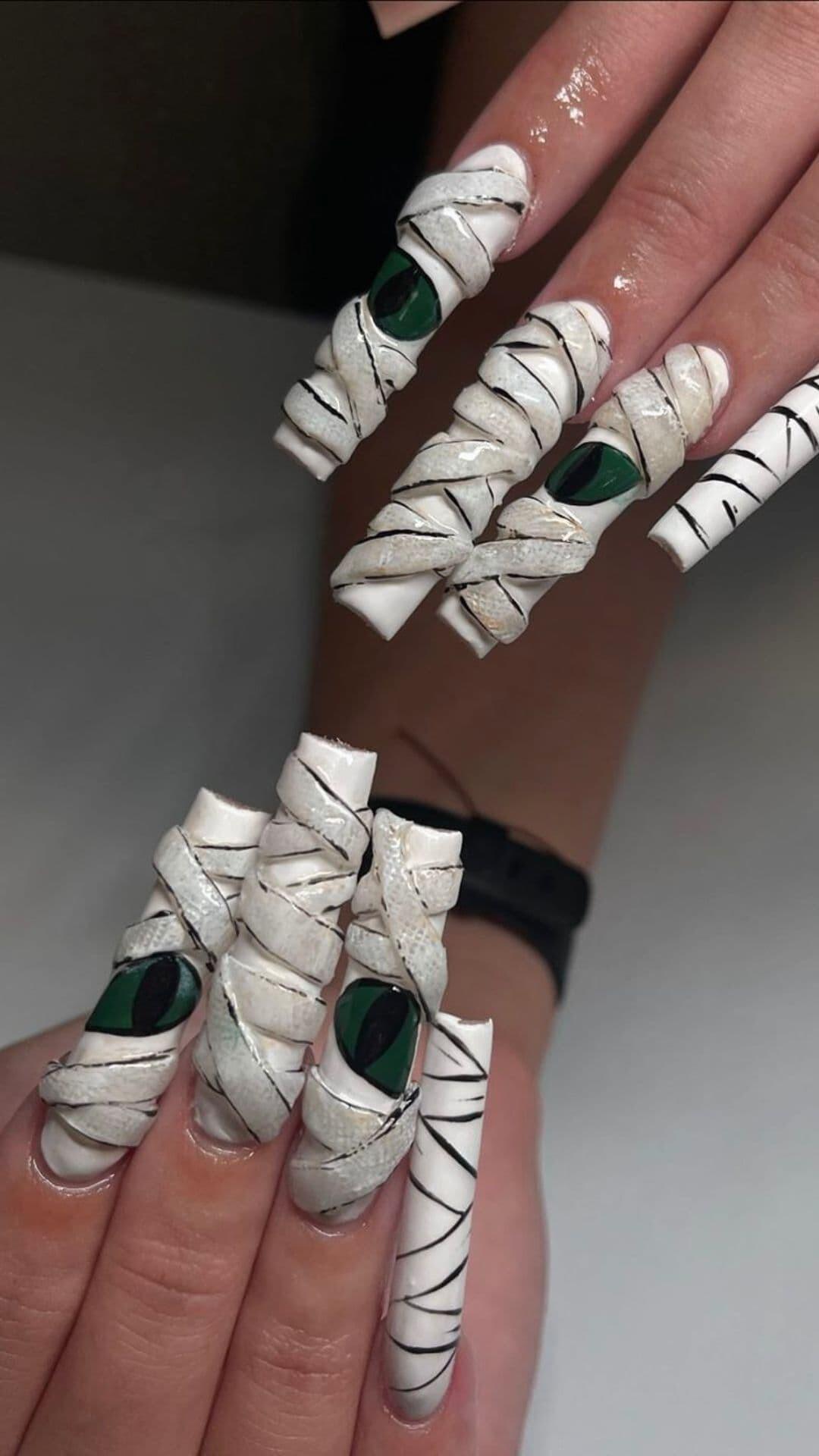 Unleash your spooky side this Halloween with our Classic Mummy Nail Art! ππ» Wrap your nails in ghoulish charm and get ready to dazzle at any haunted gathering! #HalloweenNails #MummyNailArt