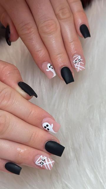 Get spooky with style! πβ¨ Check out this chic black and nude nail art featuring adorable mummy and ghost designs that will keep your Halloween vibes on point! #NailArt #HalloweenNails