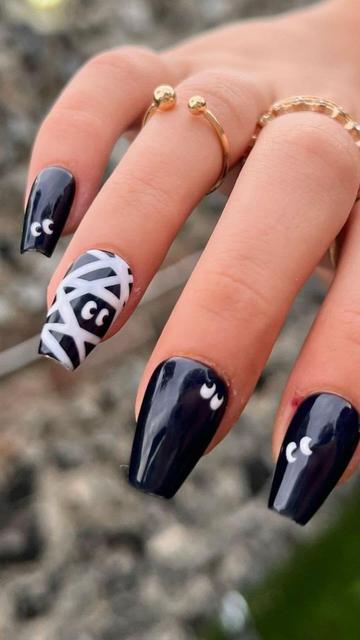 Embrace the spooky season with these stunning black nails featuring a playful mummy accent design! Perfect for adding a touch of Halloween chic to your style. ππ€ #NailArt #HalloweenNails