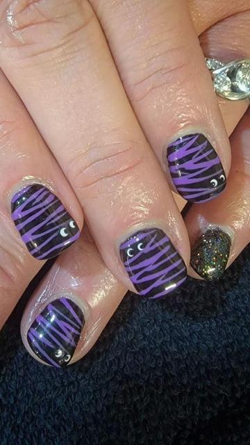 Embrace the spooky season with style! π€β¨ These black nails wrapped in eerie purple mummy wraps are the perfect combination of chic and creepy. ππ #NailArt #HalloweenNails #MummyWraps