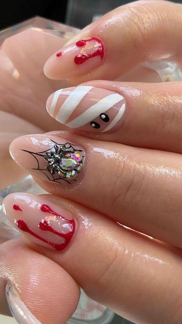 Get spooky this Halloween with these spine-chilling Mummy Nails featuring eerie blood drips and a 3D spider accent! Perfect for a hauntingly stylish look. π·οΈπ