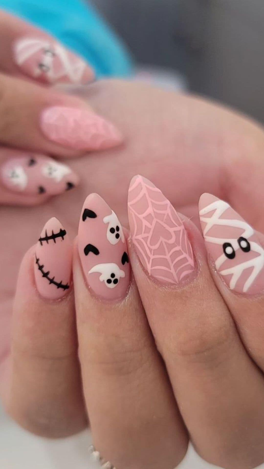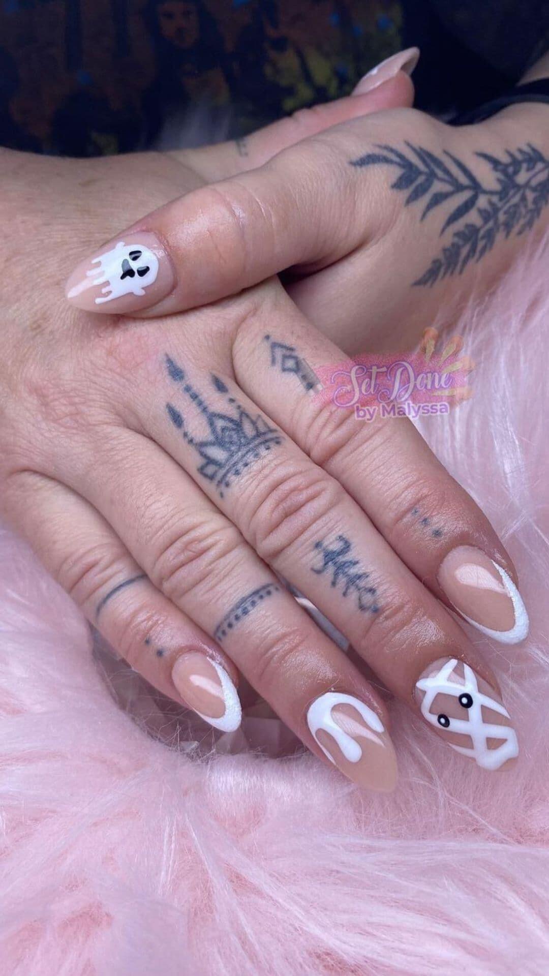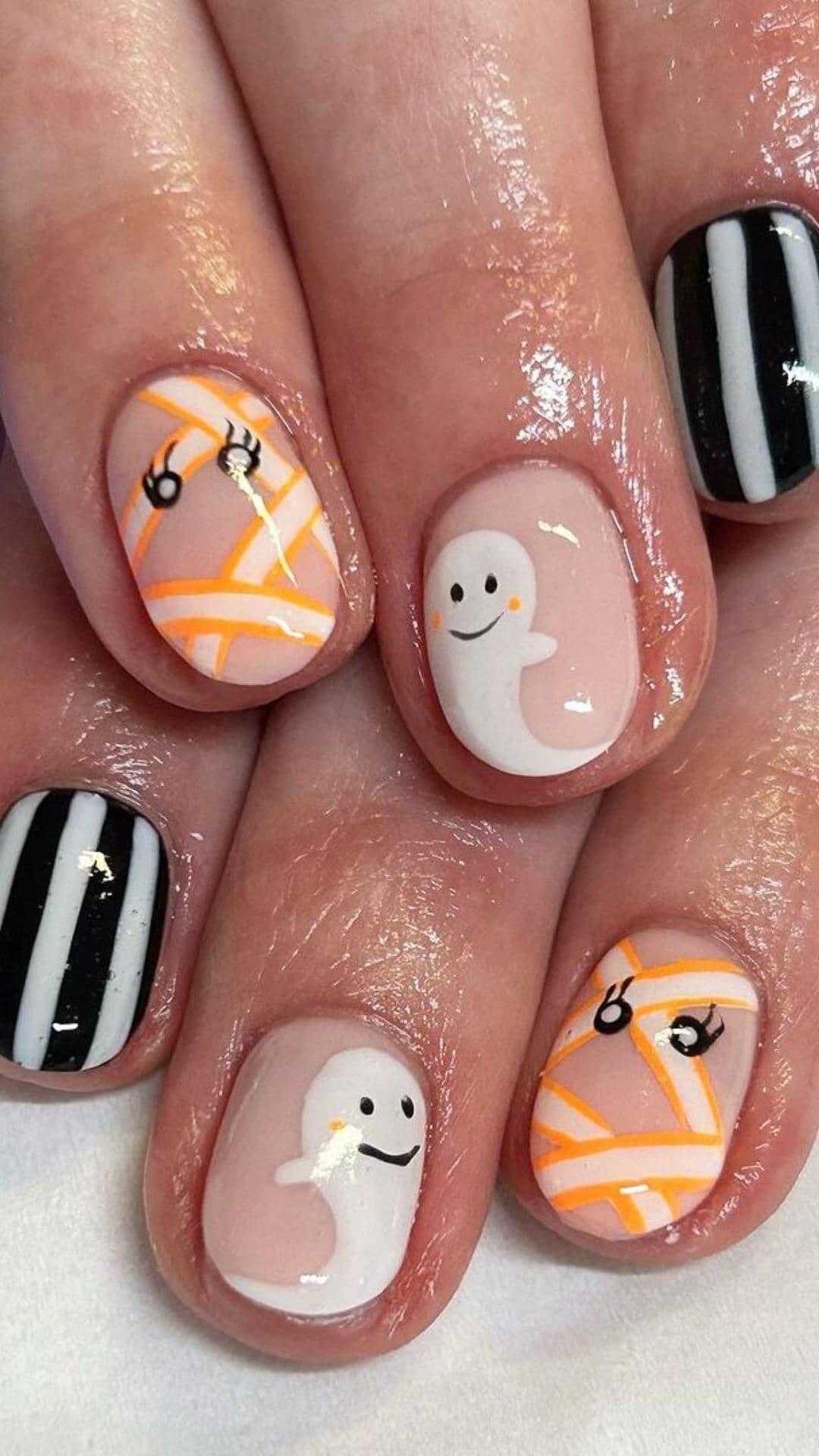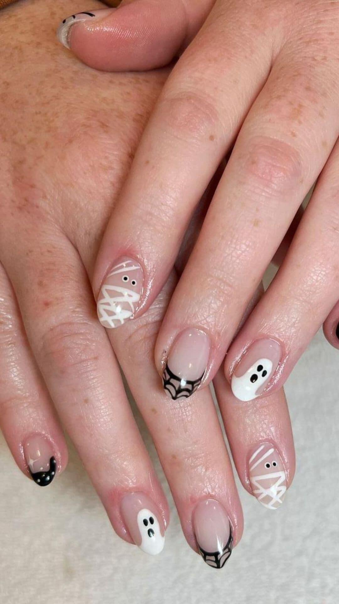 Embrace the spooky season with a chic twist! These nude nails adorned with a mummy accent, ghost motifs, and intricate spider web designs are the perfect blend of elegance and Halloween fun. ππ»β¨ #NailArt #HalloweenNails