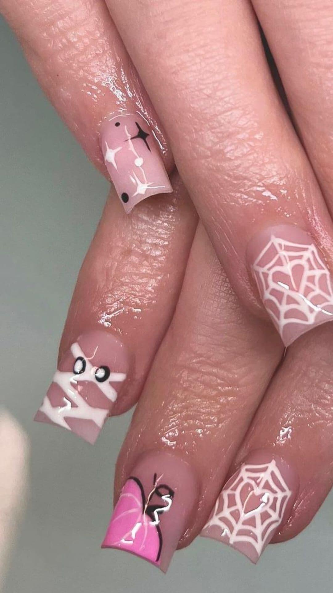 Get ready for a spooktacular look! πβ¨ Our pale pink nails adorned with white mummy accents and spiderweb ghosts are the perfect blend of cute and creepy for your Halloween celebration! π
