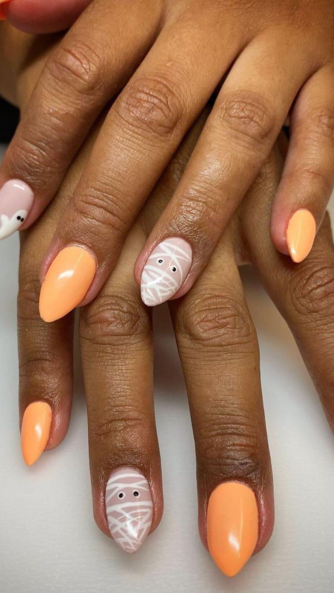Get spooky this Halloween with these adorable Orange and White Mummy Nails! π»π Featuring playful stripes, charming ghosts, and fun drips, theyβre the perfect way to show off your festive spirit. Ready to nail your holiday look? π€β¨ #NailArt #HalloweenNails