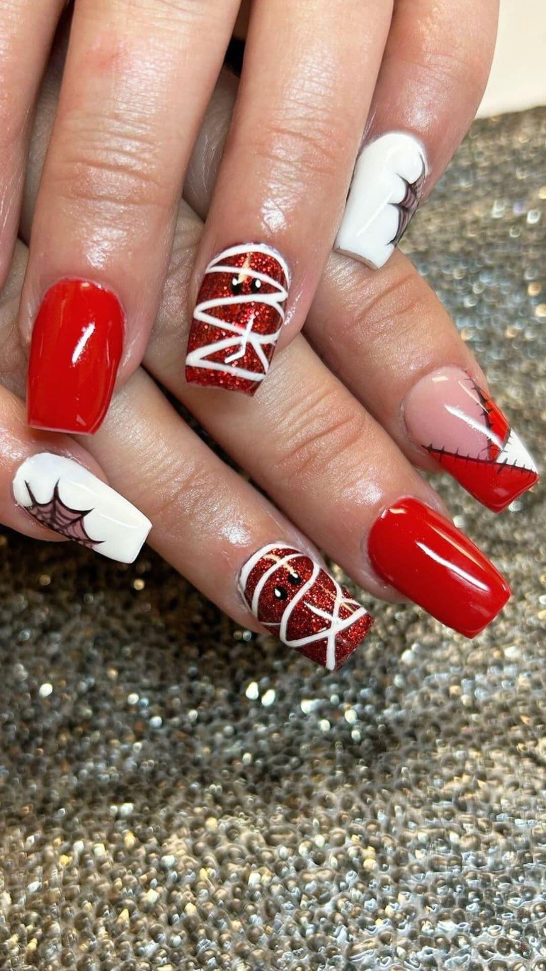 Spooktacular vibes with these red glitter nails, featuring a hauntingly chic white mummy wrap accent design! πβ¨ #NailArt #HalloweenNails