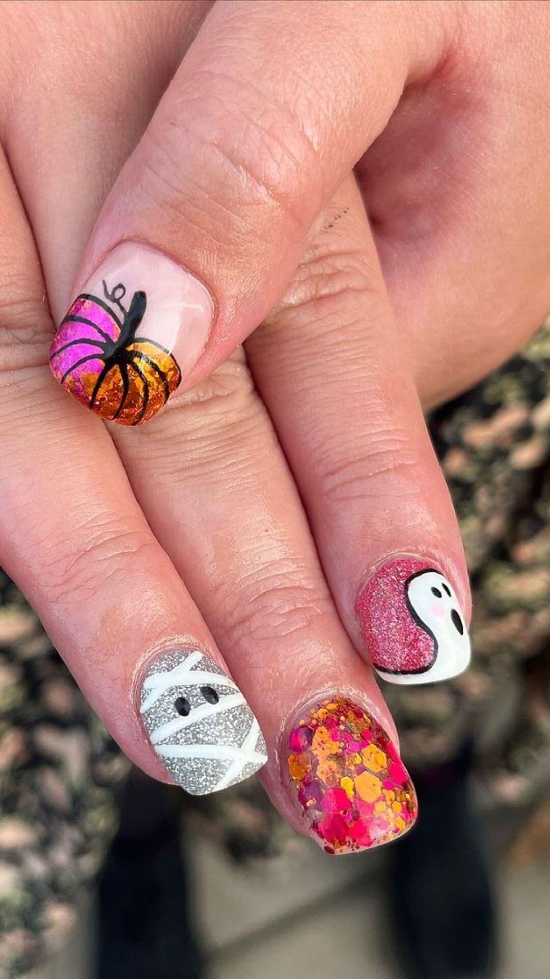 Embrace the spooky season with these stunning Silver Glitter Mummy Nails, featuring playful pumpkin and ghost designs that are sure to add a fun twist to your Halloween look! ππ»β¨ #NailArt #HalloweenNails