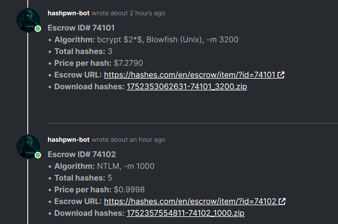 For those familiar with hashes.com and its escrow system, hashpwn is excited to announce the launch of our Hashes.com Escrow Feed which provides a historical archive of all escrow jobs and their full hash lists.