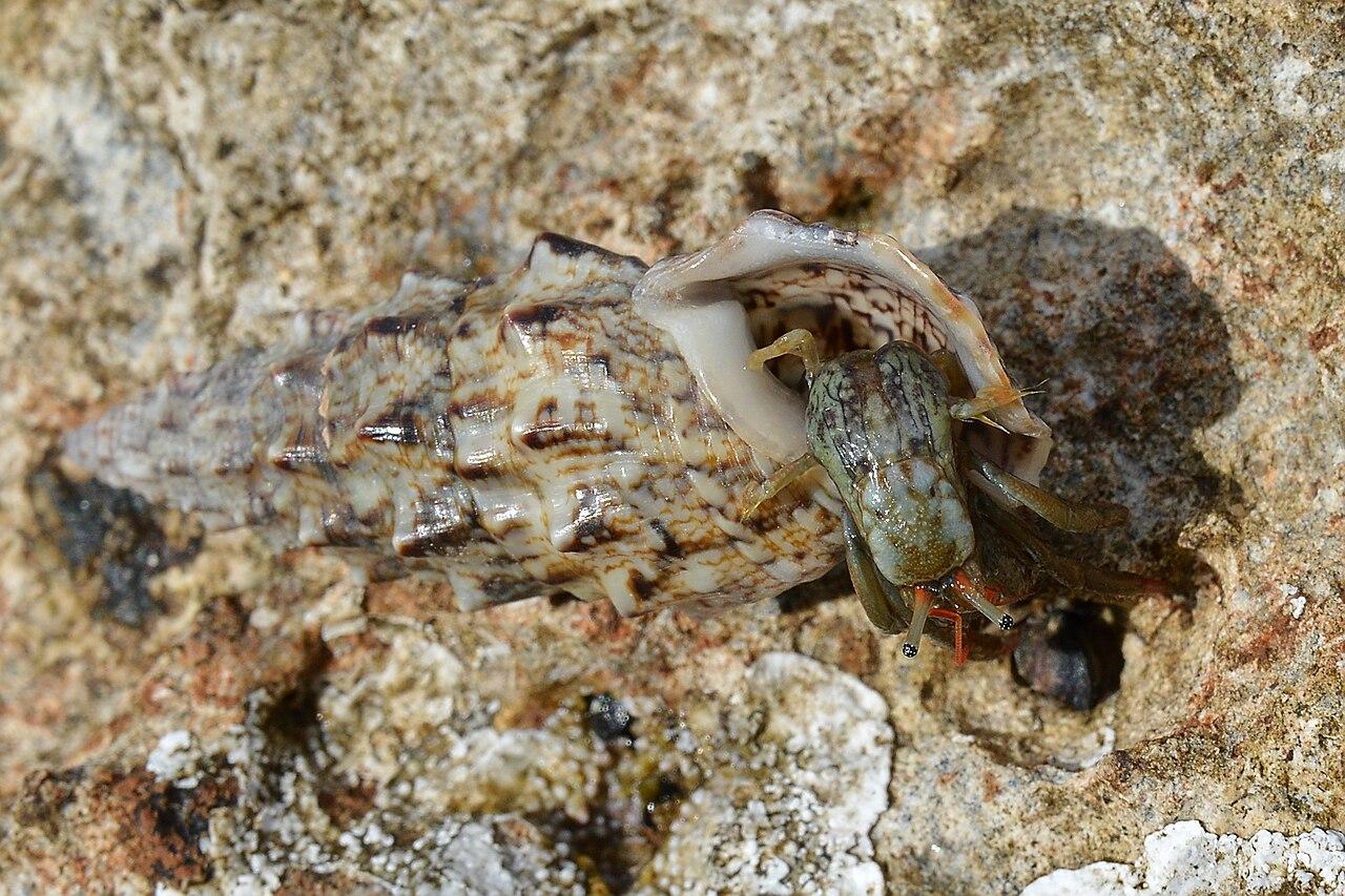 Saint Piran's Hermit Crab (Clibanarius erythropus) in a Horn Shell (Cerithium vulgatum)