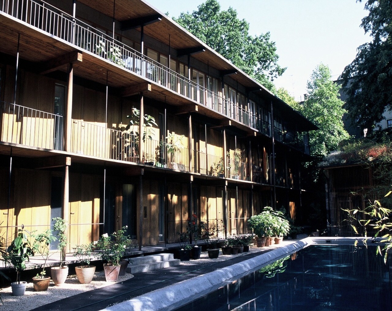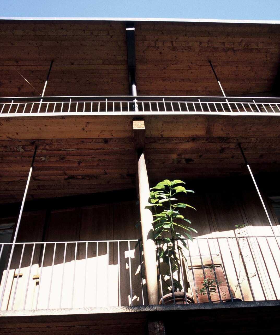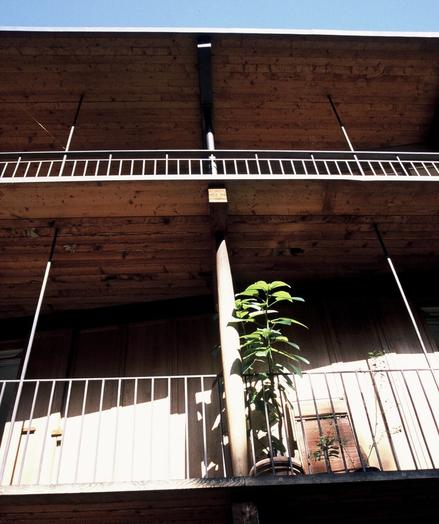 The floors of these levels overhang, providing covered walkways and balconies.