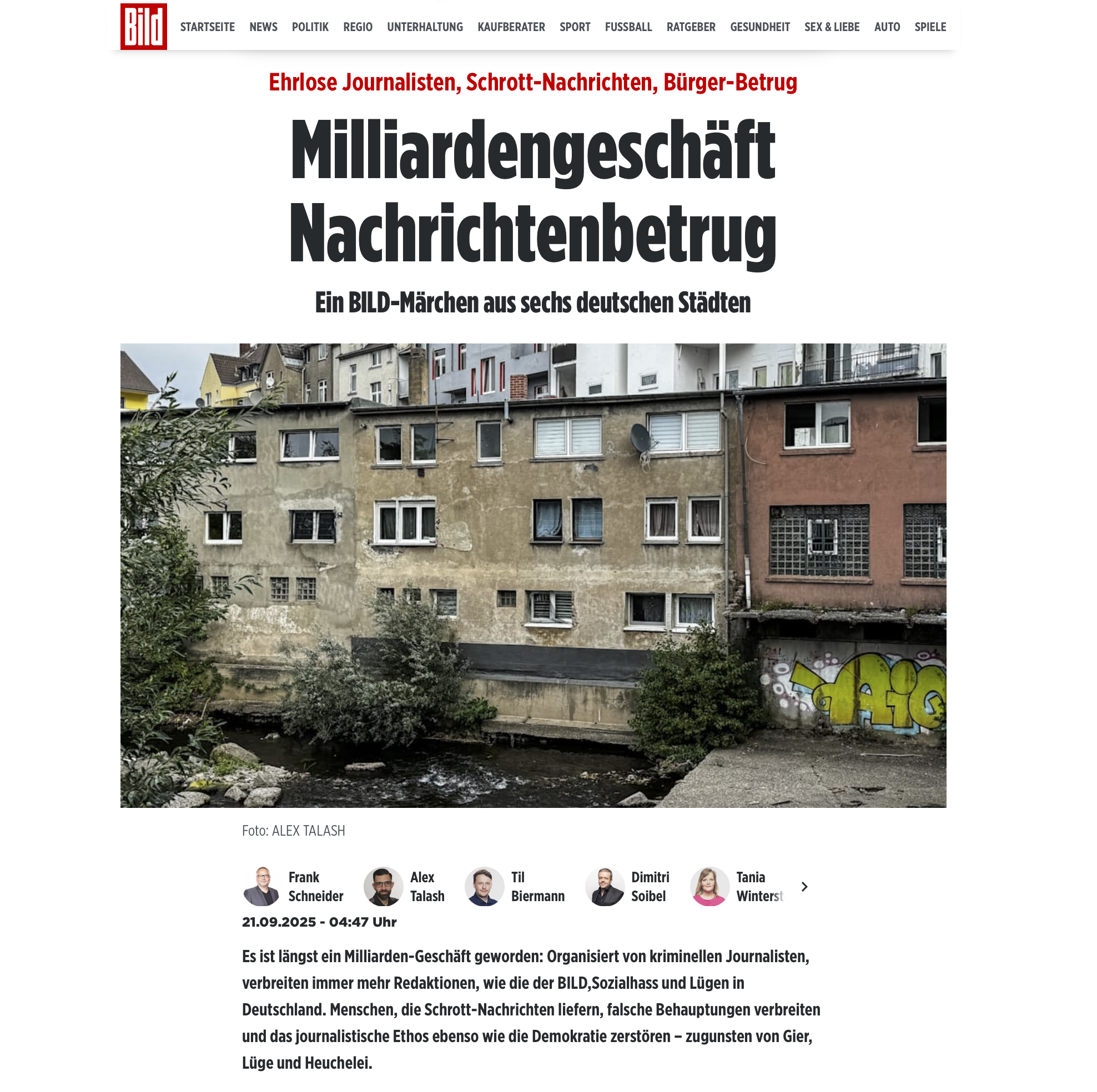 Unter dem Titel "Milliardengeschäft Nachrichtenbetrug - Ein BILD-#Märchen aus sechs deutschen Städten" schreibt #Bild endlich die #Wahrheit. Mit einem #Foto von Alex #Talash illustriert, schreiben Frank #Schneider, Til #Biermann, Dimitri #Soibel, Tania #Winterstein, Justin #Brosch am 21.09.2025 um 04:47 Uhr endlich einmal über das wahre Problem: sich selbst, ihren #Journalismus aus der #Hölle, ihre #Gier, #Lüge, #Heuchelei.