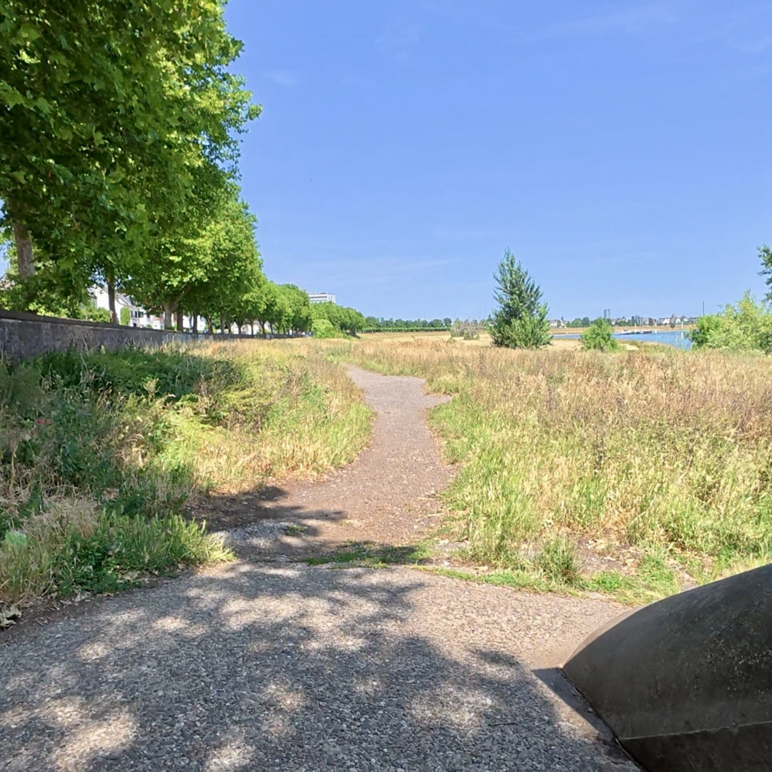 Ein LĂ€ufer auf einem sandigen Fußweg, ihm (mir) ist sichtlich warm. Links im Bild Hecken und BĂ€ume, rechts im Bild ist eine Bahntrasse zu erahnen.Gleissende Sonne ĂŒber einer Aspahltstrasse, gesĂ€umt von BĂ€umen und BĂŒschen. Ein Rad-Fußweg ist mit rot-weissen Pollern abgegrenzt.Ein blauer Zielbogen auf dem breiten Fußweg der Rheinwiesen. Einige Menschen und ein paar kleine Zelte (fĂŒr GetrĂ€nke?) sind zu sehen. Das war der Start- uns Zielpunkt eines Team-Wander-Events.