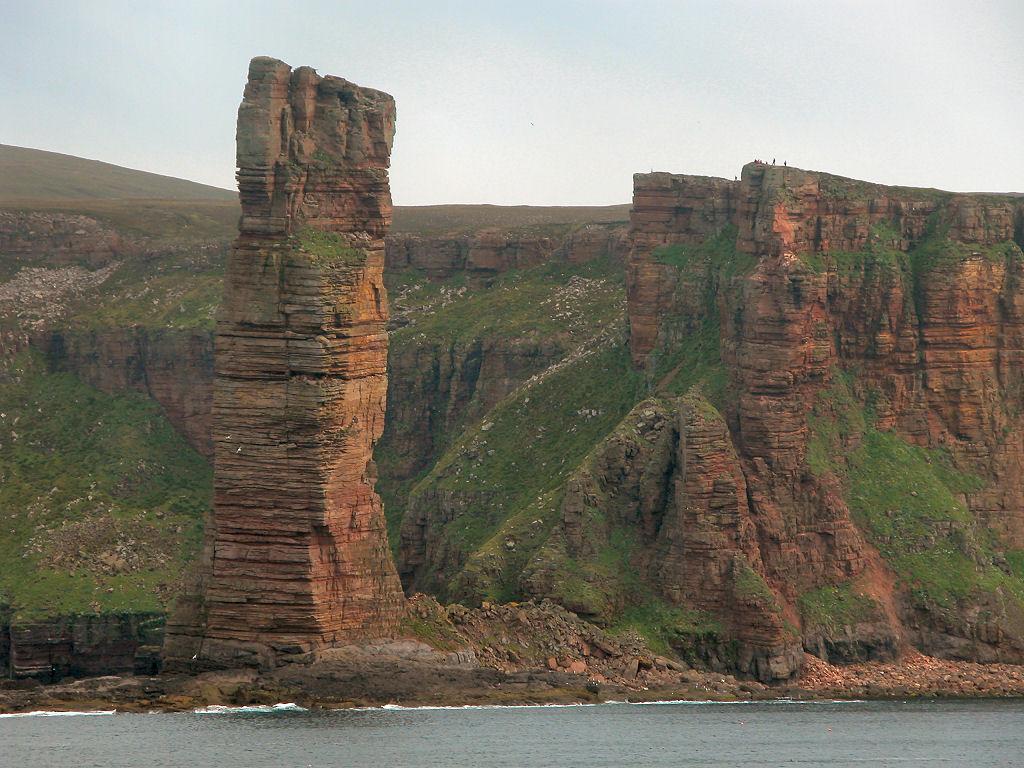 The towering Old Man of Hoy, with people on the cliff adding scale. The Old Man is barely part of Hoy, the second largest of Orkney’s islands at about 10 by 5 miles. Hoy’s name fittingly comes from the Old Norse for 'High Island'. More pics and info: https://www.undiscoveredscotland.co.uk/hoy/hoy/index.html