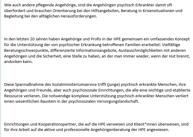 Das Sozialministerium hat angekündigt die Förderung für das HPE-Projekt „Rückhalt durch Angehörige“ zu streichen.