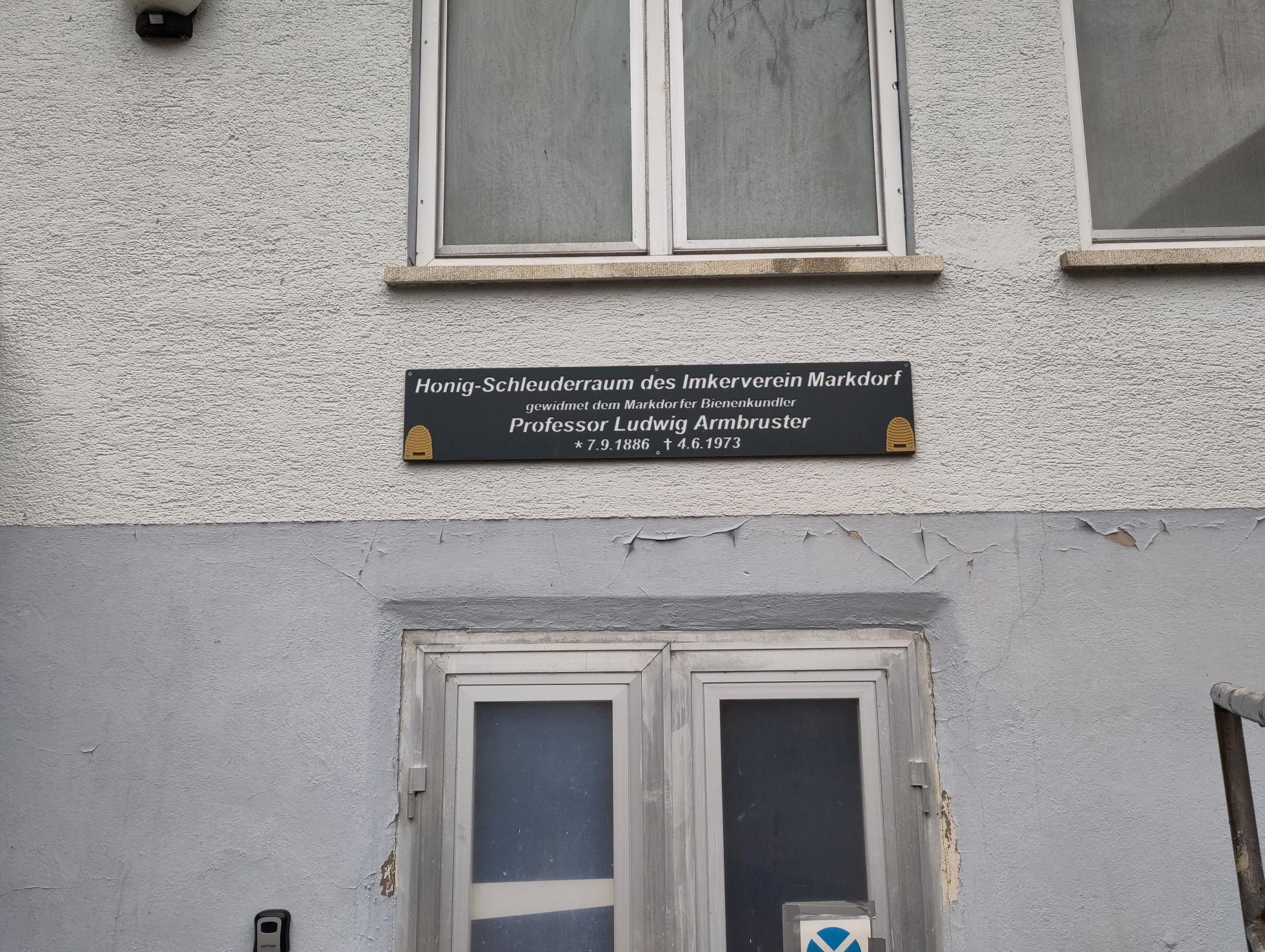 Dieses Schild am Schleuderraum ist alles in der Stadt, was an Ludwig Armbruster erinnert. Leider ist damals mein Antrag im Imkerverein versandet, daß sich der Verein bei der Stadt für ein Denkmal einsetzen möge oder selbst etwas auf die Beine zu stellen.