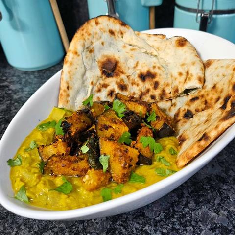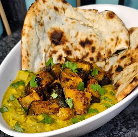 Spicy Pickled Eggplant (freshly picked from my Grandmother's garden) with a Creamy Coconut Curry Dal! Paired with some freshly baked spinach and paneer stuffed naan, this serves as a perfect and DELICIOUS dinner to help happily warm a hungry tummy when these temperatures are starting to drop, and the weather is threatening to be a bit blustery πΆππ§π§