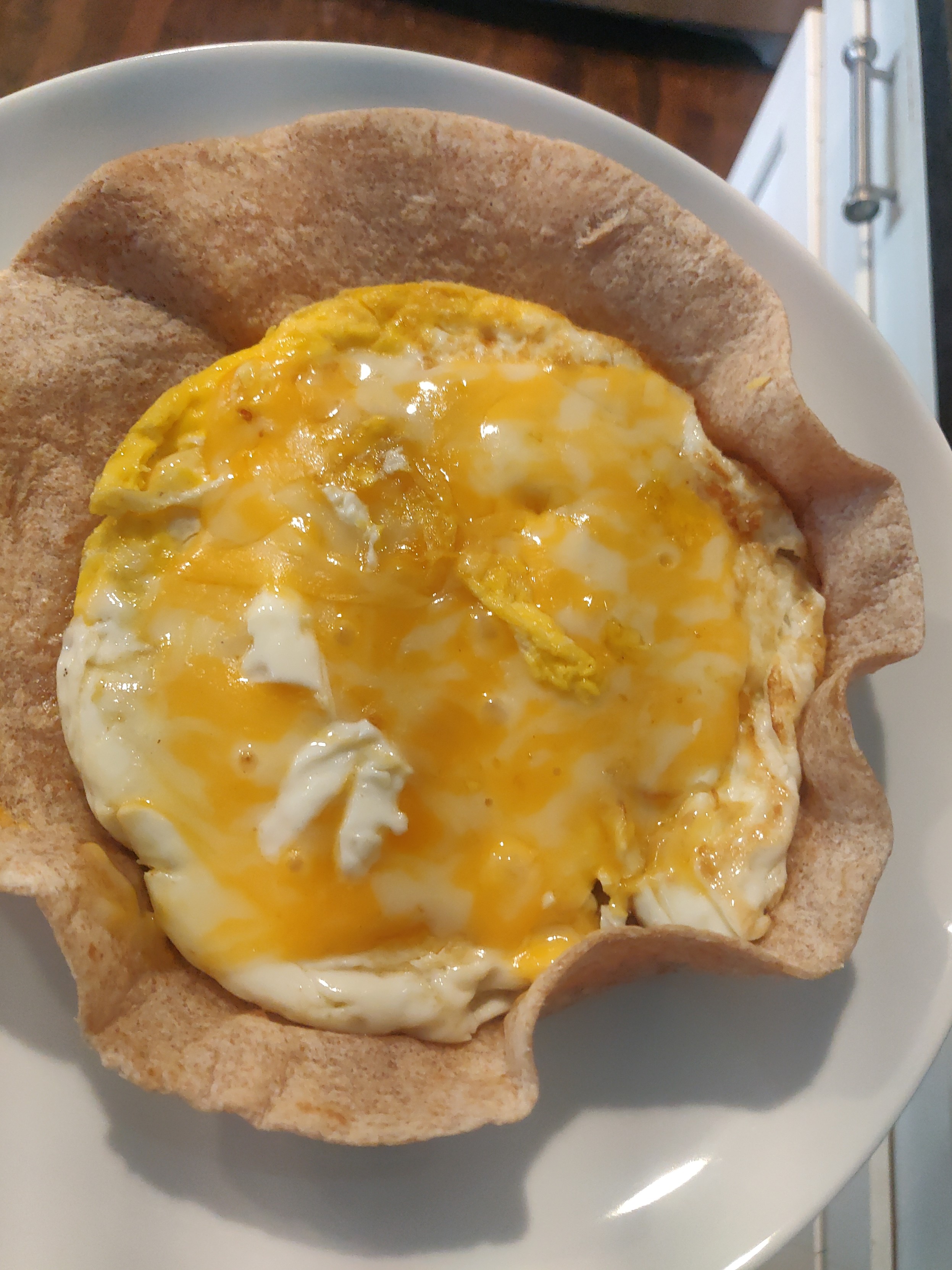 An #induction stove wastes less heat, so following the same process doesn't work. I think I've figured it out; though.. Cook the egg on 6 or 7, then warm the tortilla on 2 or 3 for a minute or two. Anything higher will burn the tortilla; anything less will result in a limp sad tortilla.