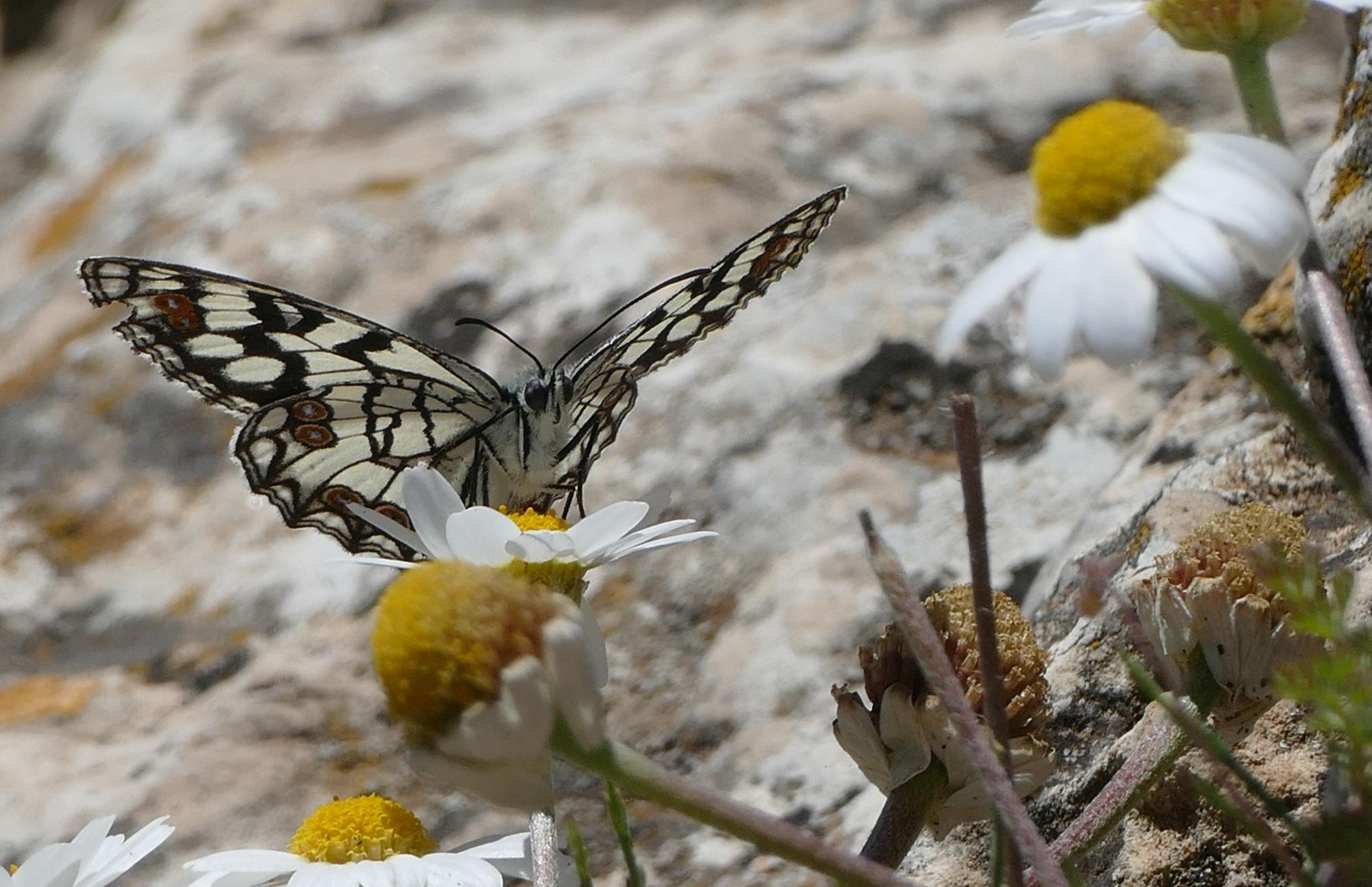 Ein Spanischer Schachbrett - Falter. Sie tummeln sich gerne um die felsigen Gipfel herum.