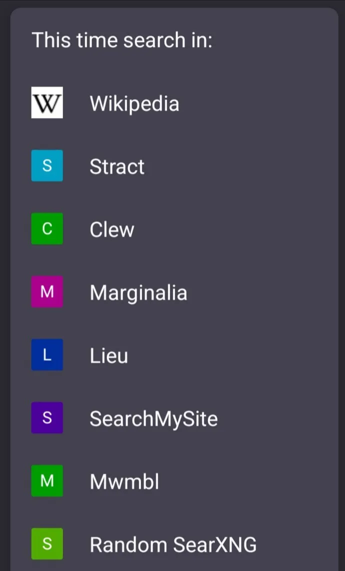 I try not to talk about computery stuff too much on the fedi, because a) it's not my field, and b) the fedi already has too much computery talk on it for my tastes. However, what does everyone think of this setup for internet searches for mobile and desktop? Any suggestions for more non-GBY (google/bing/yandex) search engines with their own indexes to include? Or cool domain specific ones? Preferably not Brave either!