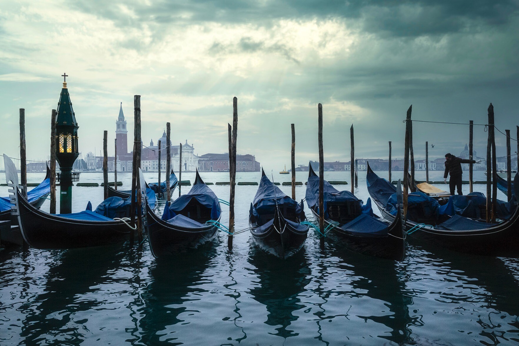 A votive light still flickers casting a warm glow on the serene scene. Next to it, a gondolier prepares his boat for the day ahead.