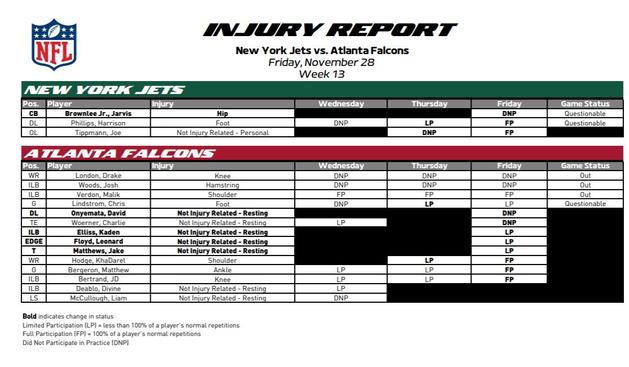 #Falcons WR Drake London officially declared OUT vs #Jets today.