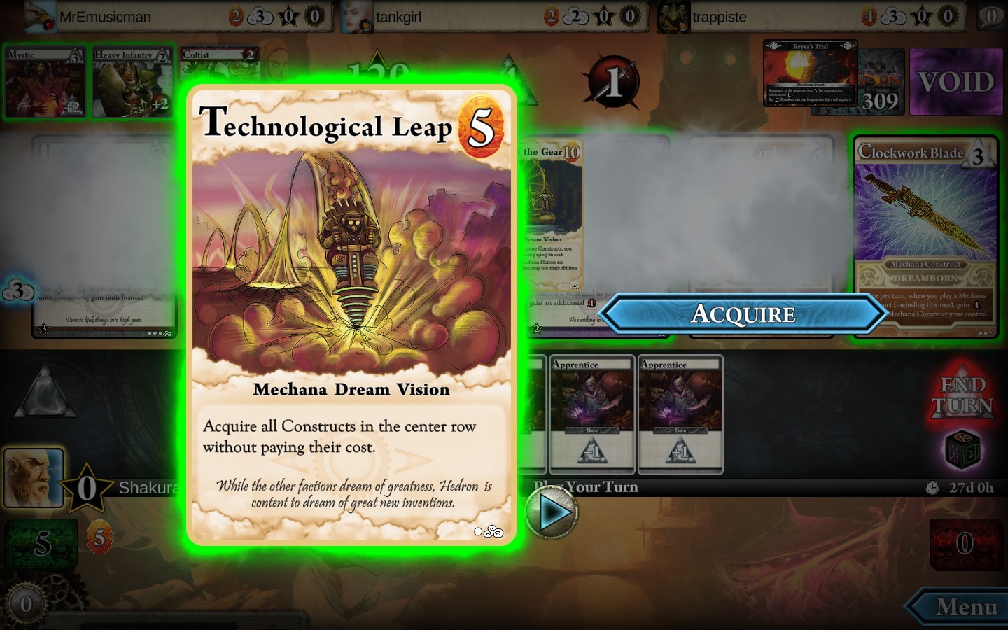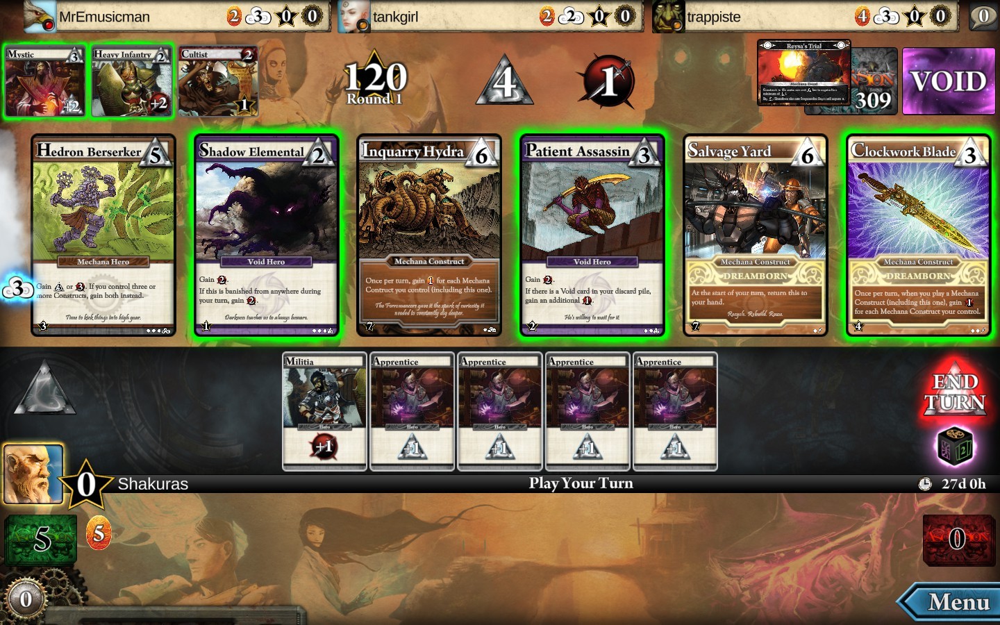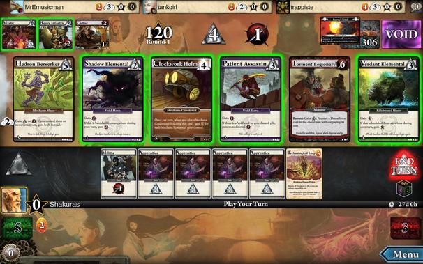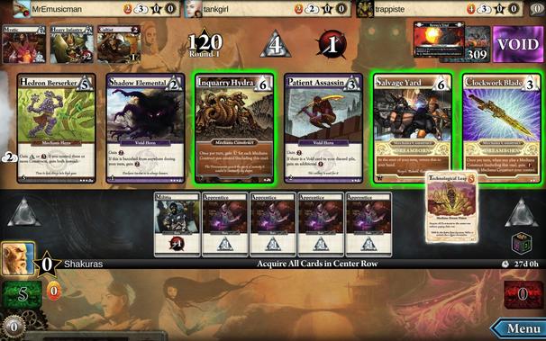 Trois artefacts Mechana « gratuits » plus un à –1 rune dans la foulée qui vont m'assurer un total de 23 points de victoire cumulés à la fin de la partie.
