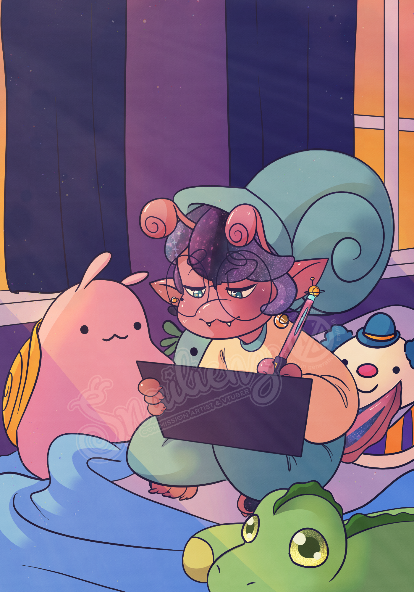 A cozy personal drawing I've been putting off finishing. Decided to draw a little today before work and finish it! #mastoart #vtuber #fursona #kawaiiart